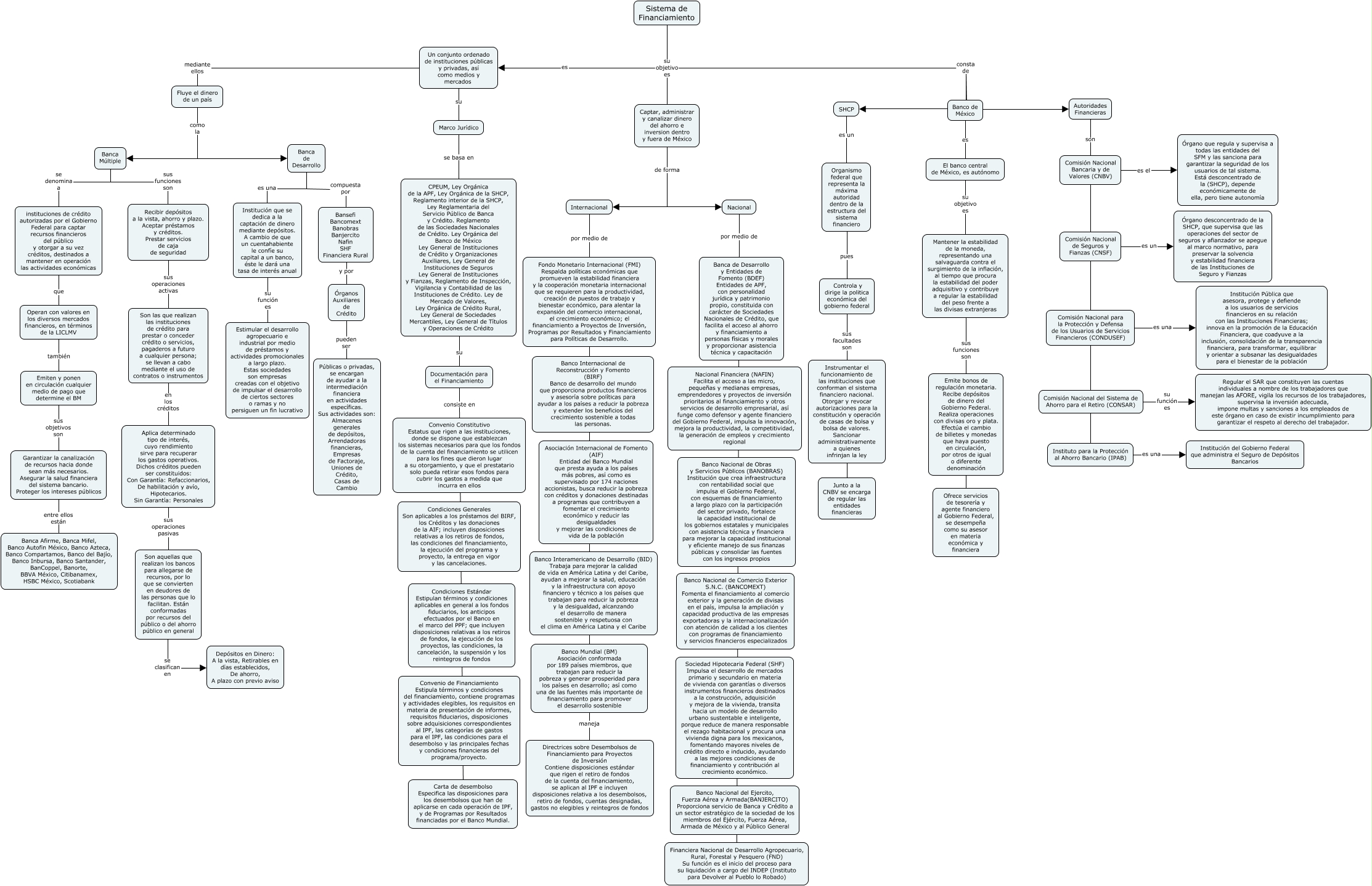 Este Cmap, tiene información relacionada con: Conceptos básicos de las instituciones, Documentación para el Financiamiento consiste en Carta de desembolso Especifica las disposiciones para los desembolsos que han de aplicarse en cada operación de IPF, y de Programas por Resultados financiadas por el Banco Mundial., Recibir depósitos a la vista, ahorro y plazo. Aceptar préstamos y créditos. Prestar servicios de caja de seguridad sus operaciones activas Son las que realizan las instituciones de crédito para prestar o conceder crédito o servicios, pagaderos a futuro a cualquier persona; se llevan a cabo mediante el uso de contratos o instrumentos, Comisión Nacional del Sistema de Ahorro para el Retiro (CONSAR) su función es Regular el SAR que constituyen las cuentas individuales a nombre de los trabajadores que manejan las AFORE, vigila los recursos de los trabajadores, supervisa la inversión adecuada, impone multas y sanciones a los empleados de este órgano en caso de existir incumplimiento para garantizar el respeto al derecho del trabajador., Banca Múltiple se denomina a instituciones de crédito autorizadas por el Gobierno Federal para captar recursos financieros del público y otorgar a su vez créditos, destinados a mantener en operación las actividades económicas, Marco Jurídico se basa en CPEUM, Ley Orgánica de la APF, Ley Orgánica de la SHCP, Reglamento interior de la SHCP, Ley Reglamentaria del Servicio Público de Banca y Crédito. Reglamento de las Sociedades Nacionales de Crédito. Ley Orgánica del Banco de México Ley General de Instituciones de Crédito y Organizaciones Auxiliares, Ley General de Instituciones de Seguros Ley General de Instituciones y Fianzas, Reglamento de Inspección, Vigilancia y Contabilidad de las Instituciones de Crédito. Ley de Mercado de Valores, Ley Orgánica de Crédito Rural, Ley General de Sociedades Mercantiles, Ley General de Títulos y Operaciones de Crédito, Órganos Auxiliares de Crédito pueden ser Públicas o privadas, se encargan de ayudar a la intermediación financiera en actividades específicas. Sus actividades son: Almacenes generales de depósitos, Arrendadoras financieras, Empresas de Factoraje, Uniones de Crédito, Casas de Cambio, Autoridades Financieras son Instituto para la Protección al Ahorro Bancario (IPAB), Banca Múltiple sus funciones son Recibir depósitos a la vista, ahorro y plazo. Aceptar préstamos y créditos. Prestar servicios de caja de seguridad, Sistema de Financiamiento consta de Autoridades Financieras, Internacional por medio de Banco Mundial (BM) Asociación conformada por 189 países miembros, que trabajan para reducir la pobreza y generar prosperidad para los países en desarrollo; así como una de las fuentes más importante de financiamiento para promover el desarrollo sostenible, Banco de México es El banco central de México, es autónomo, Son las que realizan las instituciones de crédito para prestar o conceder crédito o servicios, pagaderos a futuro a cualquier persona; se llevan a cabo mediante el uso de contratos o instrumentos en los créditos Aplica determinado tipo de interés, cuyo rendimiento sirve para recuperar los gastos operativos. Dichos créditos pueden ser constituidos: Con Garantía: Refaccionarios, De habilitación y avío, Hipotecarios. Sin Garantía: Personales, Banca de Desarrollo compuesta por Bansefi Bancomext Banobras Banjercito Nafin SHF Financiera Rural, Banca de Desarrollo es una Institución que se dedica a la captación de dinero mediante depósitos. A cambio de que un cuentahabiente le confíe su capital a un banco, éste le dará una tasa de interés anual, El banco central de México, es autónomo su objetivo es Mantener la estabilidad de la moneda, representando una salvaguarda contra el surgimiento de la inflación, al tiempo que procura la estabilidad del poder adquisitivo y contribuye a regular la estabilidad del peso frente a las divisas extranjeras, Captar, administrar y canalizar dinero del ahorro e inversion dentro y fuera de México de forma Internacional, Nacional por medio de Financiera Nacional de Desarrollo Agropecuario, Rural, Forestal y Pesquero (FND) Su función es el inicio del proceso para su liquidación a cargo del INDEP (Instituto para Devolver al Pueblo lo Robado), Garantizar la canalización de recursos hacia donde sean más necesarios. Asegurar la salud financiera del sistema bancario. Proteger los intereses públicos entre ellos están Banca Afirme, Banca Mifel, Banco Autofin México, Banco Azteca, Banco Compartamos, Banco del Bajío, Banco Inbursa, Banco Santander, BanCoppel, Banorte, BBVA México, Citibanamex, HSBC México, Scotiabank, Captar, administrar y canalizar dinero del ahorro e inversion dentro y fuera de México de forma Nacional, Fluye el dinero de un país como la Banca de Desarrollo