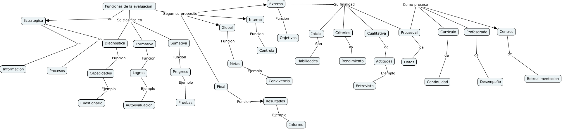 Este Cmap, tiene información relacionada con: Funciones de la evaluacion, Profesorado de Desempeño, Criterios es Rendimiento, Funciones de la evaluacion Se clasifica en Sumativa, Externa Su finalidad Inicial, Funciones de la evaluacion Se clasifica en Formativa, Inicial Son Habilidades, Funciones de la evaluacion Segun su proposito Final, Funciones de la evaluacion es Estrategica, Sumativa Funcion Progreso, Externa Su finalidad Procesual, Final Funcion Resultados, Curriculo de Continuidad, Resultados Ejemplo Informe, Procesual de Datos, Funciones de la evaluacion Se clasifica en Diagnostica, Logros Ejemplo Autoevaluacion, Global Funcion Metas, Funciones de la evaluacion Segun su proposito Externa, Estrategica de Procesos, Externa Su finalidad Criterios
