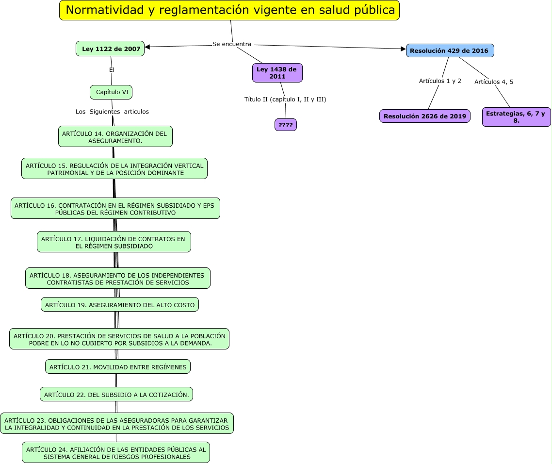 Este Cmap, tiene información relacionada con: Normatividad y reglamentación vigente en salud pública, Normatividad y reglamentación vigente en salud pública Se encuentra Ley 1122 de 2007, Normatividad y reglamentación vigente en salud pública Se encuentra Resolución 429 de 2016, Capítulo VI Los Siguientes articulos ARTÍCULO 14. ORGANIZACIÓN DEL ASEGURAMIENTO., Capítulo VI Los Siguientes articulos ARTÍCULO 20. PRESTACIÓN DE SERVICIOS DE SALUD A LA POBLACIÓN POBRE EN LO NO CUBIERTO POR SUBSIDIOS A LA DEMANDA., Capítulo VI Los Siguientes articulos ARTÍCULO 17. LIQUIDACIÓN DE CONTRATOS EN EL RÉGIMEN SUBSIDIADO, Capítulo VI Los Siguientes articulos ARTÍCULO 23. OBLIGACIONES DE LAS ASEGURADORAS PARA GARANTIZAR LA INTEGRALIDAD Y CONTINUIDAD EN LA PRESTACIÓN DE LOS SERVICIOS, Capítulo VI Los Siguientes articulos ARTÍCULO 22. DEL SUBSIDIO A LA COTIZACIÓN., Normatividad y reglamentación vigente en salud pública Se encuentra Ley 1438 de 2011, Capítulo VI Los Siguientes articulos ARTÍCULO 24. AFILIACIÓN DE LAS ENTIDADES PÚBLICAS AL SISTEMA GENERAL DE RIESGOS PROFESIONALES, Capítulo VI Los Siguientes articulos ARTÍCULO 21. MOVILIDAD ENTRE REGÍMENES, Resolución 429 de 2016 Artículos 4, 5 Estrategias, 6, 7 y 8., Ley 1438 de 2011 Título II (capítulo I, II y III) ????, Capítulo VI Los Siguientes articulos ARTÍCULO 18. ASEGURAMIENTO DE LOS INDEPENDIENTES CONTRATISTAS DE PRESTACIÓN DE SERVICIOS, Capítulo VI Los Siguientes articulos ARTÍCULO 16. CONTRATACIÓN EN EL RÉGIMEN SUBSIDIADO Y EPS PÚBLICAS DEL RÉGIMEN CONTRIBUTIVO, Capítulo VI Los Siguientes articulos ARTÍCULO 19. ASEGURAMIENTO DEL ALTO COSTO, Capítulo VI Los Siguientes articulos ARTÍCULO 15. REGULACIÓN DE LA INTEGRACIÓN VERTICAL PATRIMONIAL Y DE LA POSICIÓN DOMINANTE, Ley 1122 de 2007 El Capítulo VI, Resolución 429 de 2016 Artículos 1 y 2 Resolución 2626 de 2019
