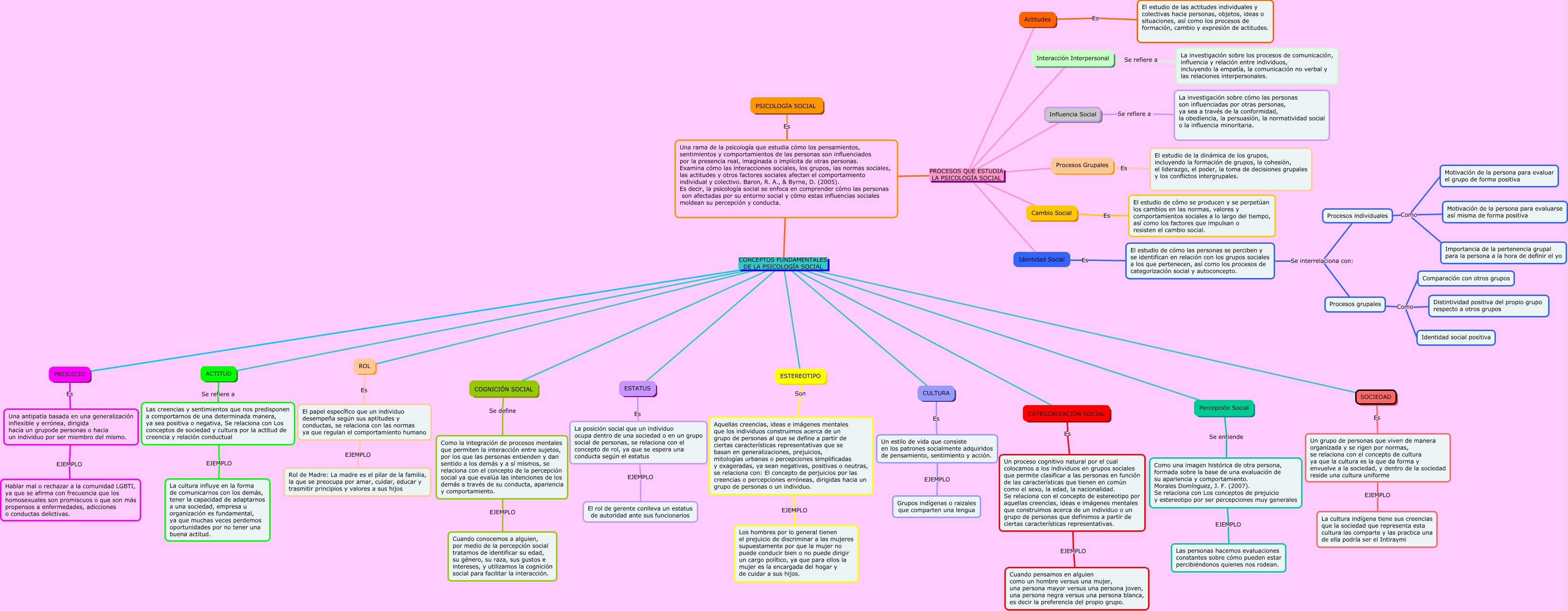 Este Cmap, tiene información relacionada con: PSICOLOGIA SOCIAL, ESTEREOTIPO Son Aquellas creencias, ideas e imágenes mentales que los individuos construimos acerca de un grupo de personas al que se define a partir de ciertas características representativas que se basan en generalizaciones, prejuicios, mitologías urbanas o percepciones simplificadas y exageradas, ya sean negativas, positivas o neutras, se relaciona con: El concepto de perjuicios por las creencias o percepciones erróneas, dirigidas hacia un grupo de personas o un individuo., Una rama de la psicología que estudia cómo los pensamientos, sentimientos y comportamientos de las personas son influenciados por la presencia real, imaginada o implícita de otras personas. Examina cómo las interacciones sociales, los grupos, las normas sociales, las actitudes y otros factores sociales afectan el comportamiento individual y colectivo. Baron, R. A., & Byrne, D. (2005). Es decir, la psicología social se enfoca en comprender cómo las personas son afectadas por su entorno social y cómo estas influencias sociales moldean su percepción y conducta. PROCESOS QUE ESTUDIA LA PSICOLOGÍA SOCIAL Procesos Grupales, Una rama de la psicología que estudia cómo los pensamientos, sentimientos y comportamientos de las personas son influenciados por la presencia real, imaginada o implícita de otras personas. Examina cómo las interacciones sociales, los grupos, las normas sociales, las actitudes y otros factores sociales afectan el comportamiento individual y colectivo. Baron, R. A., & Byrne, D. (2005). Es decir, la psicología social se enfoca en comprender cómo las personas son afectadas por su entorno social y cómo estas influencias sociales moldean su percepción y conducta. PROCESOS QUE ESTUDIA LA PSICOLOGÍA SOCIAL Identidad Social, CATEGORIZACIÓN SOCIAL Es Un proceso cognitivo natural por el cual colocamos a los individuos en grupos sociales que permite clasificar a las personas en función de las características que tienen en común como el sexo, la edad, la nacionalidad. Se relaciona con el concepto de estereotipo por aquellas creencias, ideas e imágenes mentales que construimos acerca de un individuo o un grupo de personas que definimos a partir de ciertas características representativas., Procesos individuales Como Motivación de la persona para evaluar el grupo de forma positiva, Una rama de la psicología que estudia cómo los pensamientos, sentimientos y comportamientos de las personas son influenciados por la presencia real, imaginada o implícita de otras personas. Examina cómo las interacciones sociales, los grupos, las normas sociales, las actitudes y otros factores sociales afectan el comportamiento individual y colectivo. Baron, R. A., & Byrne, D. (2005). Es decir, la psicología social se enfoca en comprender cómo las personas son afectadas por su entorno social y cómo estas influencias sociales moldean su percepción y conducta. CONCEPTOS FUNDAMENTALES DE LA PSICOLOGÍA SOCIAL ACTITUD, Una rama de la psicología que estudia cómo los pensamientos, sentimientos y comportamientos de las personas son influenciados por la presencia real, imaginada o implícita de otras personas. Examina cómo las interacciones sociales, los grupos, las normas sociales, las actitudes y otros factores sociales afectan el comportamiento individual y colectivo. Baron, R. A., & Byrne, D. (2005). Es decir, la psicología social se enfoca en comprender cómo las personas son afectadas por su entorno social y cómo estas influencias sociales moldean su percepción y conducta. CONCEPTOS FUNDAMENTALES DE LA PSICOLOGÍA SOCIAL SOCIEDAD, Una rama de la psicología que estudia cómo los pensamientos, sentimientos y comportamientos de las personas son influenciados por la presencia real, imaginada o implícita de otras personas. Examina cómo las interacciones sociales, los grupos, las normas sociales, las actitudes y otros factores sociales afectan el comportamiento individual y colectivo. Baron, R. A., & Byrne, D. (2005). Es decir, la psicología social se enfoca en comprender cómo las personas son afectadas por su entorno social y cómo estas influencias sociales moldean su percepción y conducta. CONCEPTOS FUNDAMENTALES DE LA PSICOLOGÍA SOCIAL PREJUICIO, SOCIEDAD Es Un grupo de personas que viven de manera organizada y se rigen por normas, se relaciona con el concepto de cultura ya que la cultura es la que da forma y envuelve a la sociedad, y dentro de la sociedad reside una cultura uniforme, El estudio de cómo las personas se perciben y se identifican en relación con los grupos sociales a los que pertenecen, así como los procesos de categorización social y autoconcepto. Se interrelaciona con: Procesos individuales, Una rama de la psicología que estudia cómo los pensamientos, sentimientos y comportamientos de las personas son influenciados por la presencia real, imaginada o implícita de otras personas. Examina cómo las interacciones sociales, los grupos, las normas sociales, las actitudes y otros factores sociales afectan el comportamiento individual y colectivo. Baron, R. A., & Byrne, D. (2005). Es decir, la psicología social se enfoca en comprender cómo las personas son afectadas por su entorno social y cómo estas influencias sociales moldean su percepción y conducta. CONCEPTOS FUNDAMENTALES DE LA PSICOLOGÍA SOCIAL COGNICIÓN SOCIAL, Aquellas creencias, ideas e imágenes mentales que los individuos construimos acerca de un grupo de personas al que se define a partir de ciertas características representativas que se basan en generalizaciones, prejuicios, mitologías urbanas o percepciones simplificadas y exageradas, ya sean negativas, positivas o neutras, se relaciona con: El concepto de perjuicios por las creencias o percepciones erróneas, dirigidas hacia un grupo de personas o un individuo. EJEMPLO Los hombres por lo general tienen el prejuicio de discriminar a las mujeres supuestamente por que la mujer no puede conduc