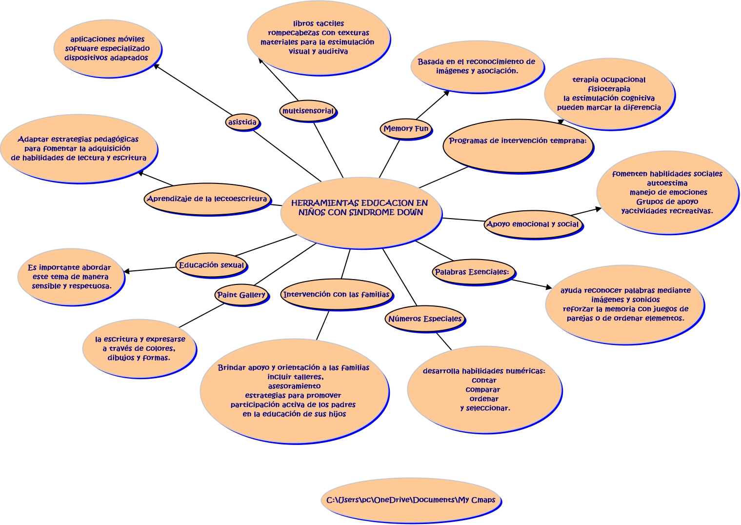 Este Cmap, tiene información relacionada con: HERRAMIENTAS TECNOLOGICAS, HERRAMIENTAS EDUCACION EN NIÑOS CON SINDROME DOWN Apoyo emocional y social fomenten habilidades sociales autoestima manejo de emociones Grupos de apoyo yactividades recreativas., HERRAMIENTAS EDUCACION EN NIÑOS CON SINDROME DOWN Números Especiales desarrolla habilidades numéricas: contar comparar ordenar y seleccionar., HERRAMIENTAS EDUCACION EN NIÑOS CON SINDROME DOWN Programas de intervención temprana: terapia ocupacional fisioterapia la estimulación cognitiva pueden marcar la diferencia, HERRAMIENTAS EDUCACION EN NIÑOS CON SINDROME DOWN Palabras Esenciales: ayuda reconocer palabras mediante imágenes y sonidos reforzar la memoria con juegos de parejas o de ordenar elementos., HERRAMIENTAS EDUCACION EN NIÑOS CON SINDROME DOWN Aprendizaje de la lectoescritura Adaptar estrategias pedagógicas para fomentar la adquisición de habilidades de lectura y escritura, HERRAMIENTAS EDUCACION EN NIÑOS CON SINDROME DOWN asistida aplicaciones móviles software especializado dispositivos adaptados, HERRAMIENTAS EDUCACION EN NIÑOS CON SINDROME DOWN multisensorial libros tactiles rompecabezas con texturas materiales para la estimulación visual y auditiva, HERRAMIENTAS EDUCACION EN NIÑOS CON SINDROME DOWN Memory Fun Basada en el reconocimiento de imágenes y asociación., HERRAMIENTAS EDUCACION EN NIÑOS CON SINDROME DOWN Intervención con las familias Brindar apoyo y orientación a las familias incluir talleres, asesoramiento estrategias para promover participación activa de los padres en la educación de sus hijos, HERRAMIENTAS EDUCACION EN NIÑOS CON SINDROME DOWN Paint Gallery la escritura y expresarse a través de colores, dibujos y formas., HERRAMIENTAS EDUCACION EN NIÑOS CON SINDROME DOWN Educación sexual Es importante abordar este tema de manera sensible y respetuosa.