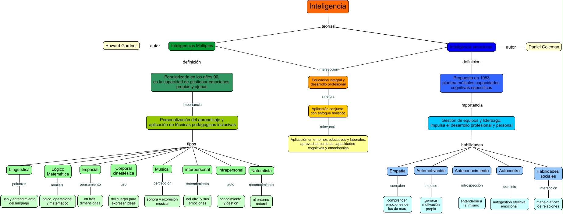 Este Cmap, tiene información relacionada con: Mapa conceptual Inteligencias, Espacial pensamiento en tres dimensiones, Personalización del aprendizaje y aplicación de técnicas pedagógicas inclusivas tipos Musical, Gestión de equipos y liderazgo, impulsa el desarrollo profesional y personal habilidades Autoconocimiento, Empatía conexión comprender emociones de los de mas, Autocontrol dominio autogestión efectiva emocional, Corporal cinestésica uso del cuerpo para expresar ideas, Inteligencia teorías Inteligencias Múltiples, Personalización del aprendizaje y aplicación de técnicas pedagógicas inclusivas tipos Lingüística, Gestión de equipos y liderazgo, impulsa el desarrollo profesional y personal habilidades Habilidades sociales, Inteligencia emocional definición Propuesta en 1983 plantea múltiples capacidades cognitivas especificas, Personalización del aprendizaje y aplicación de técnicas pedagógicas inclusivas tipos Intrapersonal, Naturalista reconocimiento el entorno natural, Inteligencias Múltiples Intersección Educación integral y desarrollo profesional, Popularizada en los años 90, es la capacidad de gestionar emociones propias y ajenas importancia Personalización del aprendizaje y aplicación de técnicas pedagógicas inclusivas, Inteligencias Múltiples autor Howard Gardner, Intrapersonal auto conocimiento y gestión, Autoconocimiento introspección entenderse a sí mismo, interpersonal entendimiento del otro, y sus emociones, Inteligencia emocional teorías Inteligencias Múltiples, Inteligencia emocional Intersección Educación integral y desarrollo profesional