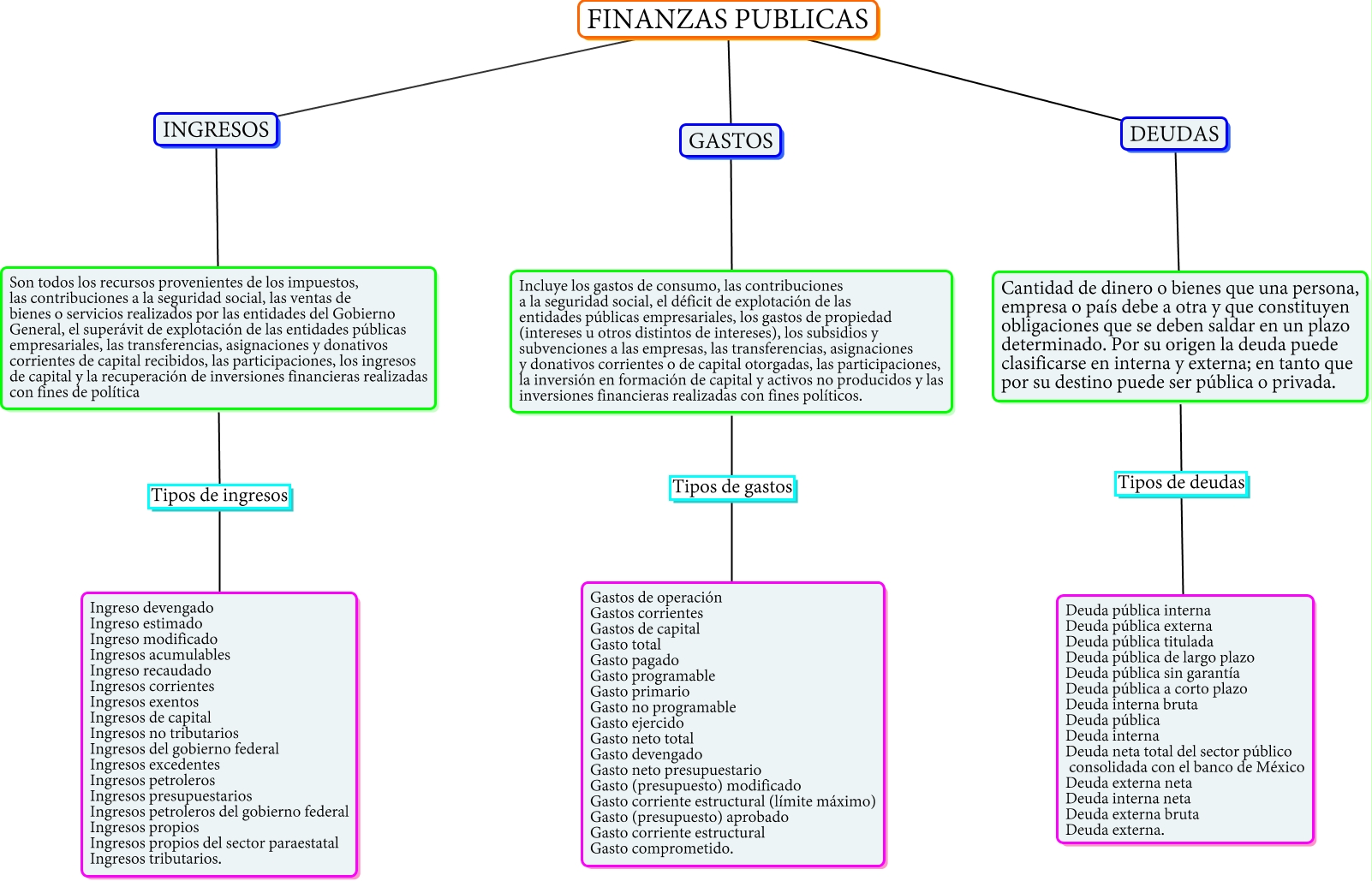 Este Cmap, tiene información relacionada con: U1 ACT 2, FINANZAS PUBLICAS DEUDAS, Cantidad de dinero o bienes que una persona, empresa o país debe a otra y que constituyen obligaciones que se deben saldar en un plazo determinado. Por su origen la deuda puede clasificarse en interna y externa; en tanto que por su destino puede ser pública o privada. Tipos de deudas Deuda pública interna Deuda pública externa Deuda pública titulada Deuda pública de largo plazo Deuda pública sin garantía Deuda pública a corto plazo Deuda interna bruta Deuda pública Deuda interna Deuda neta total del sector público consolidada con el banco de México Deuda externa neta Deuda interna neta Deuda externa bruta Deuda externa., Son todos los recursos provenientes de los impuestos, las contribuciones a la seguridad social, las ventas de bienes o servicios realizados por las entidades del Gobierno General, el superávit de explotación de las entidades públicas empresariales, las transferencias, asignaciones y donativos corrientes de capital recibidos, las participaciones, los ingresos de capital y la recuperación de inversiones financieras realizadas con fines de política Tipos de ingresos Ingreso devengado Ingreso estimado Ingreso modificado Ingresos acumulables Ingreso recaudado Ingresos corrientes Ingresos exentos Ingresos de capital Ingresos no tributarios Ingresos del gobierno federal Ingresos excedentes Ingresos petroleros Ingresos presupuestarios Ingresos petroleros del gobierno federal Ingresos propios Ingresos propios del sector paraestatal Ingresos tributarios., DEUDAS Cantidad de dinero o bienes que una persona, empresa o país debe a otra y que constituyen obligaciones que se deben saldar en un plazo determinado. Por su origen la deuda puede clasificarse en interna y externa; en tanto que por su destino puede ser pública o privada., FINANZAS PUBLICAS GASTOS, INGRESOS Son todos los recursos provenientes de los impuestos, las contribuciones a la seguridad social, las ventas de bienes o servicios realizados por las entidades del Gobierno General, el superávit de explotación de las entidades públicas empresariales, las transferencias, asignaciones y donativos corrientes de capital recibidos, las participaciones, los ingresos de capital y la recuperación de inversiones financieras realizadas con fines de política, FINANZAS PUBLICAS INGRESOS, Incluye los gastos de consumo, las contribuciones a la seguridad social, el déficit de explotación de las entidades públicas empresariales, los gastos de propiedad (intereses u otros distintos de intereses), los subsidios y subvenciones a las empresas, las transferencias, asignaciones y donativos corrientes o de capital otorgadas, las participaciones, la inversión en formación de capital y activos no producidos y las inversiones financieras realizadas con fines políticos. Tipos de gastos Gastos de operación Gastos corrientes Gastos de capital Gasto total Gasto pagado Gasto programable Gasto primario Gasto no programable Gasto ejercido Gasto neto total Gasto devengado Gasto neto presupuestario Gasto (presupuesto) modificado Gasto corriente estructural (límite máximo) Gasto (presupuesto) aprobado Gasto corriente estructural Gasto comprometido., GASTOS Incluye los gastos de consumo, las contribuciones a la seguridad social, el déficit de explotación de las entidades públicas empresariales, los gastos de propiedad (intereses u otros distintos de intereses), los subsidios y subvenciones a las empresas, las transferencias, asignaciones y donativos corrientes o de capital otorgadas, las participaciones, la inversión en formación de capital y activos no producidos y las inversiones financieras realizadas con fines políticos.
