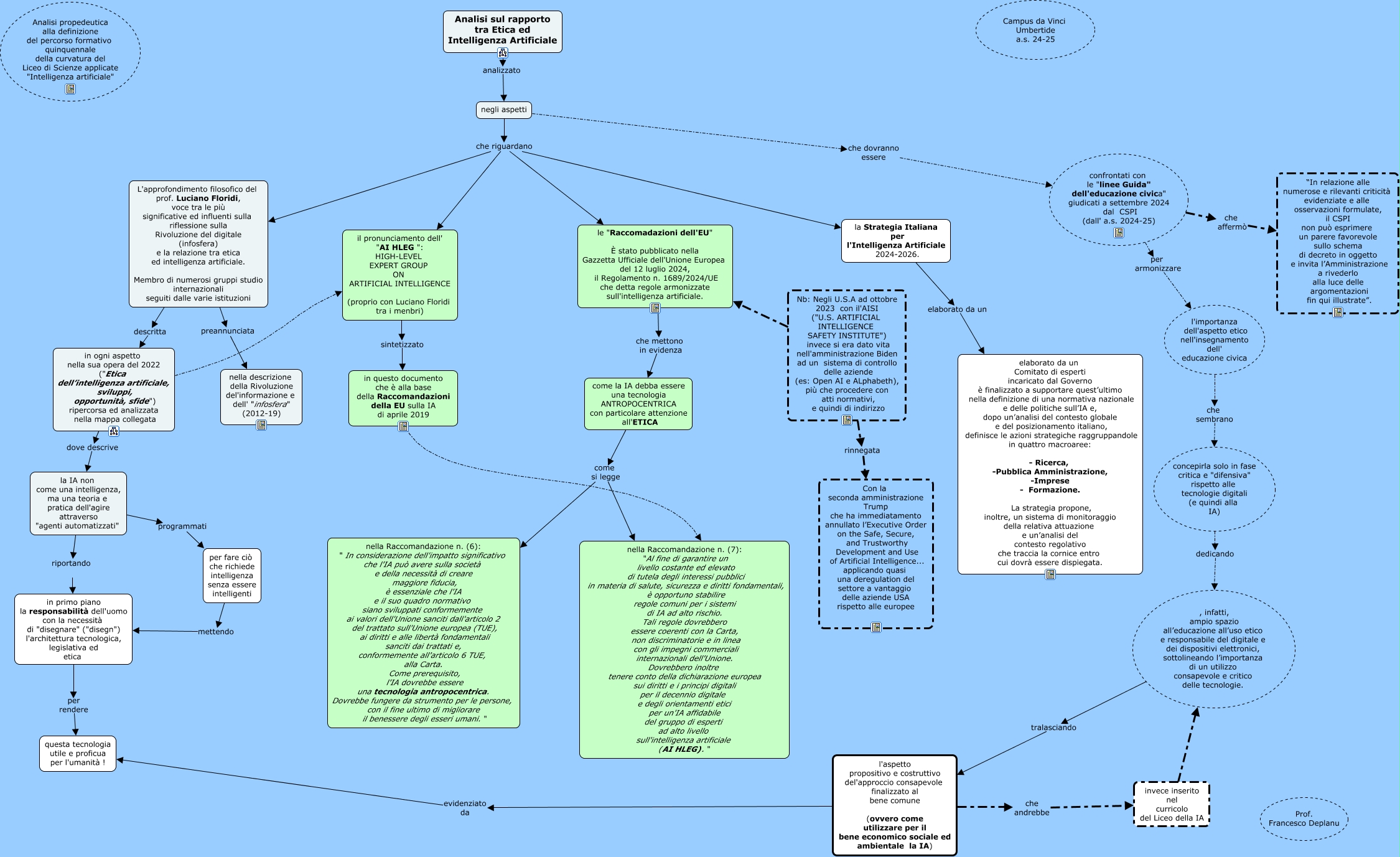 Questa Cmap, creata con IHMC CmapTools, contiene informazioni relative a: AI ed ETICA, la IA non come una intelligenza, ma una teoria e pratica dell'agire attraverso "agenti automatizzati" riportando in primo piano la responsabilità dell'uomo con la necessità di "disegnare" ("disegn") l'architettura tecnologica, legislativa ed etica, L'approfondimento filosofico del prof. Luciano Floridi, voce tra le più significative ed influenti sulla riflessione sulla Rivoluzione del digitale (infosfera) e la relazione tra etica ed intelligenza artificiale. Membro di numerosi gruppi studio internazionali seguiti dalle varie istituzioni descritta in ogni aspetto nella sua opera del 2022 ("Etica dell’intelligenza artificiale, sviluppi, opportunità, sfide") ripercorsa ed analizzata nella mappa collegata, in ogni aspetto nella sua opera del 2022 ("Etica dell’intelligenza artificiale, sviluppi, opportunità, sfide") ripercorsa ed analizzata nella mappa collegata il pronunciamento dell' "AI HLEG ": HIGH-LEVEL EXPERT GROUP ON ARTIFICIAL INTELLIGENCE (proprio con Luciano Floridi tra i menbri), la Strategia Italiana per l'Intelligenza Artificiale 2024-2026. elaborato da un elaborato da un Comitato di esperti incaricato dal Governo è finalizzato a supportare quest’ultimo nella definizione di una normativa nazionale e delle politiche sull’IA e, dopo un’analisi del contesto globale e del posizionamento italiano, definisce le azioni strategiche raggruppandole in quattro macroaree: - Ricerca, -Pubblica Amministrazione, -Imprese - Formazione. La strategia propone, inoltre, un sistema di monitoraggio della relativa attuazione e un’analisi del contesto regolativo che traccia la cornice entro cui dovrà essere dispiegata., le "Raccomadazioni dell'EU" È stato pubblicato nella Gazzetta Ufficiale dell'Unione Europea del 12 luglio 2024, il Regolamento n. 1689/2024/UE che detta regole armonizzate sull'intelligenza artificiale. che mettono in evidenza come la IA debba essere una tecnologia ANTROPOCENTRICA con particolare attenzione all'ETICA, confrontati con le "linee Guida" dell'educazione civica" giudicati a settembre 2024 dal CSPI (dall' a.s. 2024-25) che affermò “In relazione alle numerose e rilevanti criticità evidenziate e alle osservazioni formulate, il CSPI non può esprimere un parere favorevole sullo schema di decreto in oggetto e invita l’Amministrazione a rivederlo alla luce delle argomentazioni fin qui illustrate”., in primo piano la responsabilità dell'uomo con la necessità di "disegnare" ("disegn") l'architettura tecnologica, legislativa ed etica per rendere questa tecnologia utile e proficua per l'umanità !, l'aspetto propositivo e costruttivo del'approccio consapevole finalizzato al bene comune (ovvero come utilizzare per il bene economico sociale ed ambientale la IA) che andrebbe invece inserito nel curricolo del Liceo della IA, per fare ciò che richiede intelligenza senza essere intelligenti mettendo in primo piano la responsabilità dell'uomo con la necessità di "disegnare" ("disegn") l'architettura tecnologica, legislativa ed etica, l'importanza dell'aspetto etico nell'insegnamento dell' educazione civica che sembrano concepirla solo in fase critica e "difensiva" rispetto alle tecnologie digitali (e quindi alla IA), come la IA debba essere una tecnologia ANTROPOCENTRICA con particolare attenzione all'ETICA come si legge nella Raccomandazione n. (6): " In considerazione dell'impatto significativo che l'IA può avere sulla società e della necessità di creare maggiore fiducia, è essenziale che l'IA e il suo quadro normativo siano sviluppati conformemente ai valori dell'Unione sanciti dall'articolo 2 del trattato sull'Unione europea (TUE), ai diritti e alle libertà fondamentali sanciti dai trattati e, conformemente all'articolo 6 TUE, alla Carta. Come prerequisito, l'IA dovrebbe essere una tecnologia antropocentrica. Dovrebbe fungere da strumento per le persone, con il fine ultimo di migliorare il benessere degli esseri umani. ", negli aspetti che riguardano il pronunciamento dell' "AI HLEG ": HIGH-LEVEL EXPERT GROUP ON ARTIFICIAL INTELLIGENCE (proprio con Luciano Floridi tra i menbri), in ogni aspetto nella sua opera del 2022 ("Etica dell’intelligenza artificiale, sviluppi, opportunità, sfide") ripercorsa ed analizzata nella mappa collegata dove descrive la IA non come una intelligenza, ma una teoria e pratica dell'agire attraverso "agenti automatizzati", il pronunciamento dell' "AI HLEG ": HIGH-LEVEL EXPERT GROUP ON ARTIFICIAL INTELLIGENCE (proprio con Luciano Floridi tra i menbri) sintetizzato in questo documento che è alla base della Raccomandazioni della EU sulla IA di aprile 2019, Nb: Negli U.S.A ad ottobre 2023 con il'AISI ("U.S. ARTIFICIAL INTELLIGENCE SAFETY INSTITUTE") invece si era dato vita nell'amministrazione Biden ad un sistema di controllo delle aziende (es: Open AI e ALphabeth), più che procedere con atti normativi, e quindi di indirizzo rinnegata Con la seconda amministrazione Trump che ha immediatamento annullato l’Executive Order on the Safe, Secure, and Trustworthy Development and Use of Artificial Intelligence... applicando quasi una deregulation del settore a vantaggio delle aziende USA rispetto alle europee, negli aspetti che riguardano L'approfondimento filosofico del prof. Luciano Floridi, voce tra le più significative ed influenti sulla riflessione sulla Rivoluzione del digitale (infosfera) e la relazione tra etica ed intelligenza artificiale. Membro di numerosi gruppi studio internazionali seguiti dalle varie istituzioni, negli aspetti che dovranno essere confrontati con le "linee Guida" dell'educazione civica" giudicati a settembre 2024 dal CSPI (dall' a.s. 2024-25), negli aspetti che riguardano le "Raccomadazioni dell'EU" È stato pubblicato nella Gazzetta Ufficiale dell'Unione Europea del 12 luglio 2024, il Regolamento n. 1689/2024/UE che detta regole armonizzate sull'intelligenza artificiale., L'approfondimento filosofico del prof. Lu