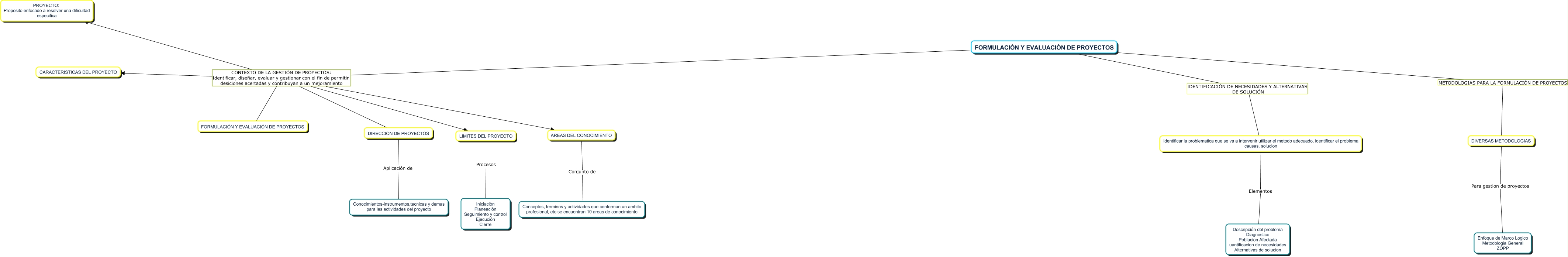 Este Cmap, tiene información relacionada con: MAPA MENTAL, FORMULACIÓN Y EVALUACIÓN DE PROYECTOS CONTEXTO DE LA GESTIÓN DE PROYECTOS: Identificar, diseñar, evaluar y gestionar con el fin de permitir desiciones acertadas y contribuyan a un mejoramiento CARACTERISTICAS DEL PROYECTO, Identificar la problematica que se va a intervenir utilizar el metodo adecuado, identificar el problema causas, solucion Elementos Descripción del problema Diagnostico Poblacion Afectada uantificacion de necesidades Alternativas de solucion, FORMULACIÓN Y EVALUACIÓN DE PROYECTOS CONTEXTO DE LA GESTIÓN DE PROYECTOS: Identificar, diseñar, evaluar y gestionar con el fin de permitir desiciones acertadas y contribuyan a un mejoramiento AREAS DEL CONOCIMIENTO, FORMULACIÓN Y EVALUACIÓN DE PROYECTOS CONTEXTO DE LA GESTIÓN DE PROYECTOS: Identificar, diseñar, evaluar y gestionar con el fin de permitir desiciones acertadas y contribuyan a un mejoramiento FORMULACIÓN Y EVALUACIÓN DE PROYECTOS, FORMULACIÓN Y EVALUACIÓN DE PROYECTOS CONTEXTO DE LA GESTIÓN DE PROYECTOS: Identificar, diseñar, evaluar y gestionar con el fin de permitir desiciones acertadas y contribuyan a un mejoramiento PROYECTO: Proposito enfocado a resolver una dificultad especifica, FORMULACIÓN Y EVALUACIÓN DE PROYECTOS IDENTIFICACIÓN DE NECESIDADES Y ALTERNATIVAS DE SOLUCIÓN Identificar la problematica que se va a intervenir utilizar el metodo adecuado, identificar el problema causas, solucion, LIMITES DEL PROYECTO Procesos Iniciación Planeación Seguimiento y control Ejecución Cierre, FORMULACIÓN Y EVALUACIÓN DE PROYECTOS CONTEXTO DE LA GESTIÓN DE PROYECTOS: Identificar, diseñar, evaluar y gestionar con el fin de permitir desiciones acertadas y contribuyan a un mejoramiento LIMITES DEL PROYECTO, DIRECCIÓN DE PROYECTOS Aplicación de Conocimientos-instrumentos,tecnicas y demas para las actividades del proyecto, FORMULACIÓN Y EVALUACIÓN DE PROYECTOS CONTEXTO DE LA GESTIÓN DE PROYECTOS: Identificar, diseñar, evaluar y gestionar con el fin de permitir desiciones acertadas y contribuyan a un mejoramiento DIRECCIÓN DE PROYECTOS, FORMULACIÓN Y EVALUACIÓN DE PROYECTOS METODOLOGIAS PARA LA FORMULACIÓN DE PROYECTOS DIVERSAS METODOLOGIAS, AREAS DEL CONOCIMIENTO Conjunto de Conceptos, terminos y actividades que conforman un ambito profesional, etc se encuentran 10 areas de conocimiento, DIVERSAS METODOLOGIAS Para gestion de proyectos Enfoque de Marco Logico Metodologia General ZOPP