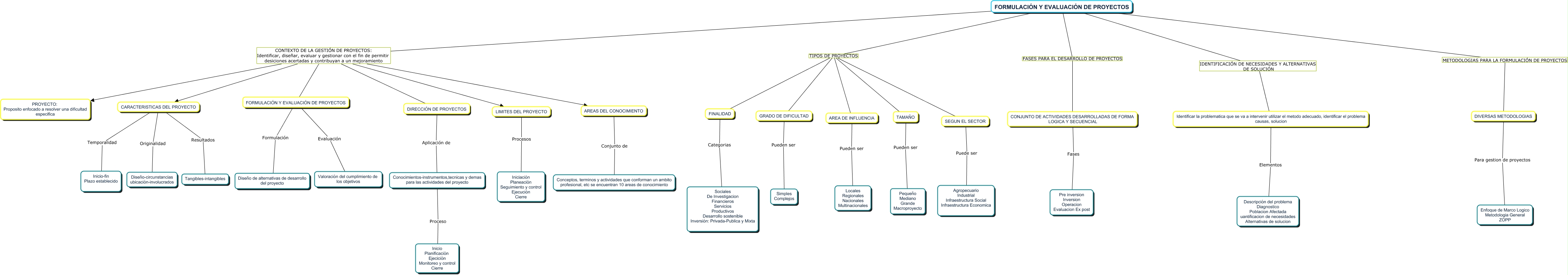 Este Cmap, tiene información relacionada con: MAPA MENTAL, FORMULACIÓN Y EVALUACIÓN DE PROYECTOS CONTEXTO DE LA GESTIÓN DE PROYECTOS: Identificar, diseñar, evaluar y gestionar con el fin de permitir desiciones acertadas y contribuyan a un mejoramiento CARACTERISTICAS DEL PROYECTO, FORMULACIÓN Y EVALUACIÓN DE PROYECTOS Evaluación Valoración del cumplimiento de los objetivos, FORMULACIÓN Y EVALUACIÓN DE PROYECTOS TIPOS DE PROYECTOS GRADO DE DIFICULTAD, Identificar la problematica que se va a intervenir utilizar el metodo adecuado, identificar el problema causas, solucion Elementos Descripción del problema Diagnostico Poblacion Afectada uantificacion de necesidades Alternativas de solucion, FORMULACIÓN Y EVALUACIÓN DE PROYECTOS Formulación Diseño de alternativas de desarrollo del proyecto, CONJUNTO DE ACTIVIDADES DESARROLLADAS DE FORMA LOGICA Y SECUENCIAL Fases Pre inversion Inversion Operacion Evaluacion Ex post, FORMULACIÓN Y EVALUACIÓN DE PROYECTOS TIPOS DE PROYECTOS TAMAÑO, SEGUN EL SECTOR Puede ser Agropecuario Industrial Infraestructura Social Infraestructura Economica, FORMULACIÓN Y EVALUACIÓN DE PROYECTOS CONTEXTO DE LA GESTIÓN DE PROYECTOS: Identificar, diseñar, evaluar y gestionar con el fin de permitir desiciones acertadas y contribuyan a un mejoramiento AREAS DEL CONOCIMIENTO, FORMULACIÓN Y EVALUACIÓN DE PROYECTOS CONTEXTO DE LA GESTIÓN DE PROYECTOS: Identificar, diseñar, evaluar y gestionar con el fin de permitir desiciones acertadas y contribuyan a un mejoramiento FORMULACIÓN Y EVALUACIÓN DE PROYECTOS, FORMULACIÓN Y EVALUACIÓN DE PROYECTOS TIPOS DE PROYECTOS FINALIDAD, FORMULACIÓN Y EVALUACIÓN DE PROYECTOS TIPOS DE PROYECTOS SEGUN EL SECTOR, FORMULACIÓN Y EVALUACIÓN DE PROYECTOS CONTEXTO DE LA GESTIÓN DE PROYECTOS: Identificar, diseñar, evaluar y gestionar con el fin de permitir desiciones acertadas y contribuyan a un mejoramiento PROYECTO: Proposito enfocado a resolver una dificultad especifica, FORMULACIÓN Y EVALUACIÓN DE PROYECTOS FASES PARA EL DESARROLLO DE PROYECTOS CONJUNTO DE ACTIVIDADES DESARROLLADAS DE FORMA LOGICA Y SECUENCIAL, CARACTERISTICAS DEL PROYECTO Originalidad Diseño-circunstancias ubicación-involucrados, FORMULACIÓN Y EVALUACIÓN DE PROYECTOS IDENTIFICACIÓN DE NECESIDADES Y ALTERNATIVAS DE SOLUCIÓN Identificar la problematica que se va a intervenir utilizar el metodo adecuado, identificar el problema causas, solucion, CARACTERISTICAS DEL PROYECTO Temporalidad Inicio-fin Plazo establecido, Conocimientos-instrumentos,tecnicas y demas para las actividades del proyecto Proceso Inicio Planificación Ejecición Monitoreo y control Cierre, GRADO DE DIFICULTAD Pueden ser Simples Complejos, TAMAÑO Pueden ser Pequeño Mediano Grande Macroproyecto