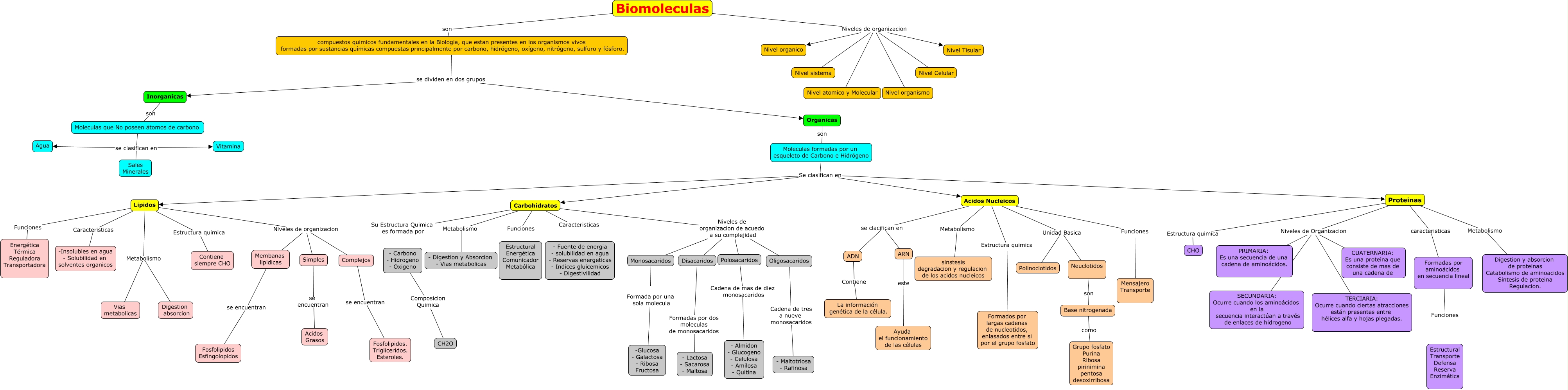 Este Cmap, tiene información relacionada con: Biomoleculas, Oligosacaridos Cadena de tres a nueve monosacaridos - Maltotriosa - Rafinosa, Moleculas que No poseen átomos de carbono se clasifican en Agua, Moleculas formadas por un esqueleto de Carbono e Hidrógeno Se clasifican en Carbohidratos, Neuclotidos son Base nitrogenada, Proteinas caracteristicas Formadas por aminoácidos en secuencia lineal, Lipidos Metabolismo Digestion absorcion, - Carbono - Hidrogeno - Oxigeno Composicion Quimica CH2O, Disacaridos Formadas por dos moleculas de monosacaridos - Lactosa - Sacarosa - Maltosa, Proteinas Niveles de Organizacion PRIMARIA: Es una secuencia de una cadena de aminoácidos., Acidos Nucleicos Funciones Mensajero Transporte, Biomoleculas son compuestos quimicos fundamentales en la Biologia, que estan presentes en los organismos vivos formadas por sustancias químicas compuestas principalmente por carbono, hidrógeno, oxígeno, nitrógeno, sulfuro y fósforo., Polosacaridos Cadena de mas de diez monosacaridos - Almidon - Glucogeno - Celulosa - Amilosa - Quitina, Formadas por aminoácidos en secuencia lineal Funciones Estructural Transporte Defensa Reserva Enzimática, Acidos Nucleicos Estructura quimica Formados por largas cadenas de nucleotidos, enlasados entre si por el grupo fosfato, Biomoleculas Niveles de organizacion Nivel organico, Carbohidratos Funciones Estructural Energética Comunicador Metabólica, Moleculas formadas por un esqueleto de Carbono e Hidrógeno Se clasifican en Acidos Nucleicos, ADN Contiene La información genética de la célula., Lipidos Funciones Energética Térmica Reguladora Transportadora, Lipidos Estructura quimica Contiene siempre CHO