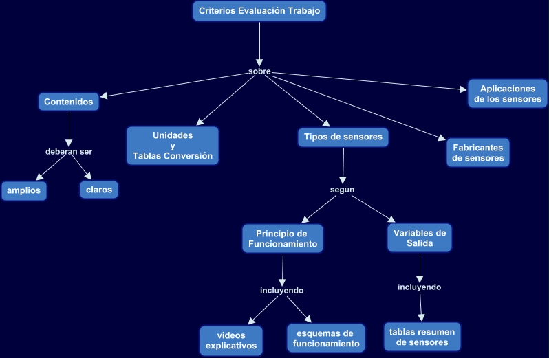 Este Cmap, tiene información relacionada con: 0.b.- Criterios Evaluación Trabajo, Contenidos deberan ser claros, Criterios Evaluación Trabajo sobre Fabricantes de sensores, Criterios Evaluación Trabajo sobre Tipos de sensores, Principio de Funcionamiento incluyendo videos explicativos, Principio de Funcionamiento incluyendo esquemas de funcionamiento, Criterios Evaluación Trabajo sobre Aplicaciones de los sensores, Criterios Evaluación Trabajo sobre Unidades y Tablas Conversión, Criterios Evaluación Trabajo sobre Contenidos, Tipos de sensores según Principio de Funcionamiento, Tipos de sensores según Variables de Salida, Contenidos deberan ser amplios, Variables de Salida incluyendo tablas resumen de sensores