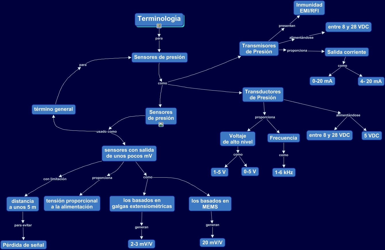Este Cmap, tiene información relacionada con: Terminolgía, Terminología para Sensores de presión, sensores con salida de unos pocos mV como los basados en MEMS, sensores con salida de unos pocos mV proporciona tensión proporcional a la alimentación, Sensores de presión usado como sensores con salida de unos pocos mV, Transductores de Presión proporciona Voltaje de alto nivel, sensores con salida de unos pocos mV como los basados en galgas extensiométricas, Transductores de Presión proporciona Frecuencia, Voltaje de alto nivel como 1-5 V, Frecuencia como 1-6 kHz, sensores con salida de unos pocos mV con limitación distancia a unos 5 m, distancia a unos 5 m para evitar Pérdida de señal, Salida corriente como 0-20 mA, Transmisores de Presión alimentándose entre 8 y 28 VDC, Sensores de presión como Sensores de presión, Transmisores de Presión proporciona Salida corriente, término general para Sensores de presión, Transductores de Presión alimentándose 5 VDC, los basados en galgas extensiométricas generan 2-3 mV/V, Voltaje de alto nivel como 0-5 V, Sensores de presión como Transmisores de Presión