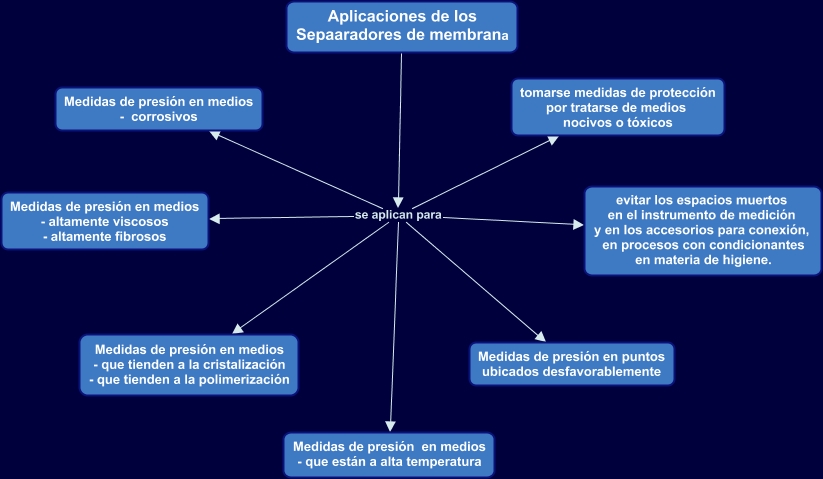 Este Cmap, tiene información relacionada con: Separador de membrana aplicaciones, Aplicaciones de los Sepaaradores de membrana se aplican para tomarse medidas de protección por tratarse de medios nocivos o tóxicos, Aplicaciones de los Sepaaradores de membrana se aplican para Medidas de presión en medios - que están a alta temperatura, Aplicaciones de los Sepaaradores de membrana se aplican para Medidas de presión en medios - altamente viscosos - altamente fibrosos, Aplicaciones de los Sepaaradores de membrana se aplican para Medidas de presión en puntos ubicados desfavorablemente, Aplicaciones de los Sepaaradores de membrana se aplican para Medidas de presión en medios - que tienden a la cristalización - que tienden a la polimerización, Aplicaciones de los Sepaaradores de membrana se aplican para evitar los espacios muertos en el instrumento de medición y en los accesorios para conexión, en procesos con condicionantes en materia de higiene., Aplicaciones de los Sepaaradores de membrana se aplican para Medidas de presión en medios - corrosivos