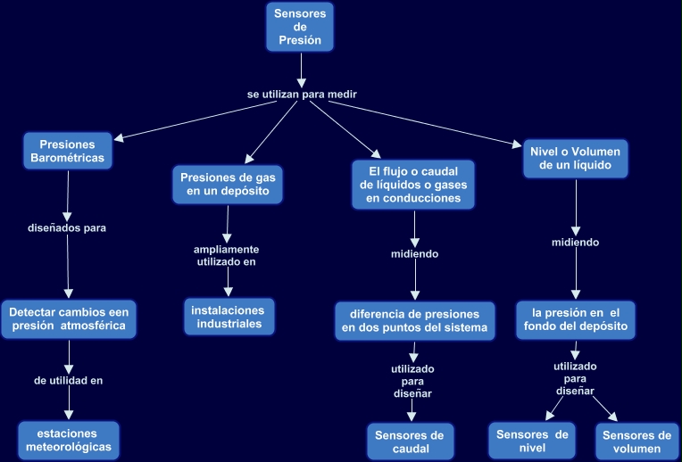 Este Cmap, tiene información relacionada con: 2.- Utilidades de los Sensores de Presión, Sensores de Presión se utilizan para medir Nivel o Volumen de un líquido, El flujo o caudal de líquidos o gases en conducciones midiendo diferencia de presiones en dos puntos del sistema, Nivel o Volumen de un líquido midiendo la presión en el fondo del depósito, la presión en el fondo del depósito utilizado para diseñar Sensores de nivel, Detectar cambios een presión atmosférica de utilidad en estaciones meteorológicas, Sensores de Presión se utilizan para medir Presiones de gas en un depósito, Sensores de Presión se utilizan para medir El flujo o caudal de líquidos o gases en conducciones, la presión en el fondo del depósito utilizado para diseñar Sensores de volumen, diferencia de presiones en dos puntos del sistema utilizado para diseñar Sensores de caudal, Presiones de gas en un depósito ampliamente utilizado en instalaciones industriales, Presiones Barométricas diseñados para Detectar cambios een presión atmosférica, Sensores de Presión se utilizan para medir Presiones Barométricas