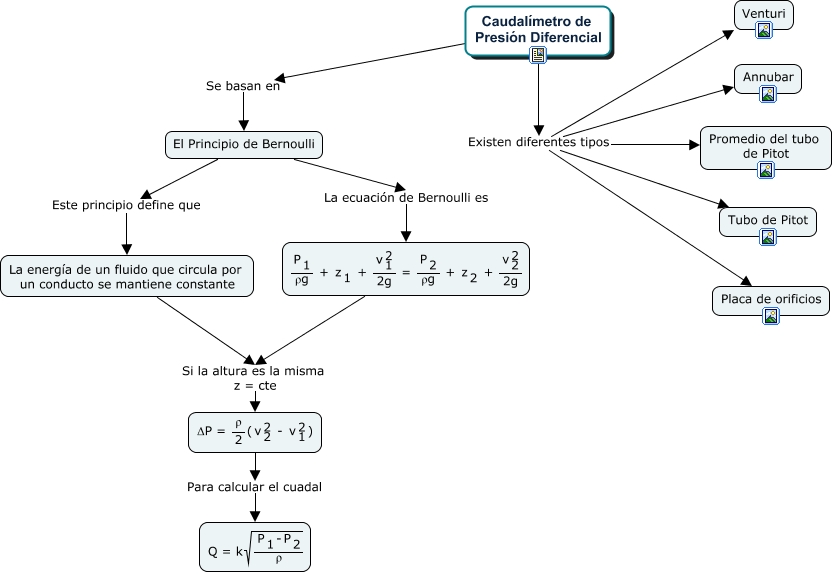 Este Cmap, tiene información relacionada con: Basados en presión, Caudalímetro de Presión Diferencial Existen diferentes tipos Venturi, El Principio de Bernoulli Este principio define que La energía de un fluido que circula por un conducto se mantiene constante, Caudalímetro de Presión Diferencial Existen diferentes tipos Tubo de Pitot, <math xmlns="http://www.w3.org/1998/Math/MathML"> <mrow> <mfrac> <mrow> <mmultiscripts> <mtext> P </mtext> <mtext> 1 </mtext> <none/> </mmultiscripts> </mrow> <mtext> ρg </mtext> </mfrac> <mtext> + </mtext> <mmultiscripts> <mtext> z </mtext> <mtext> 1 </mtext> <none/> </mmultiscripts> <mtext> + </mtext> <mfrac> <mmultiscripts> <mtext> v </mtext> <mtext> 1 </mtext> <mtext> 2 </mtext> </mmultiscripts> <mtext> 2g </mtext> </mfrac> <mtext> = </mtext> <mfrac> <mmultiscripts> <mtext> P </mtext> <mtext> 2 </mtext> <none/> </mmultiscripts> <mtext> ρg </mtext> </mfrac> <mtext> + </mtext> <mmultiscripts> <mtext> z </mtext> <mtext> 2 </mtext> <none/> </mmultiscripts> <mtext> + </mtext> <mfrac> <mmultiscripts> <mtext> v </mtext> <mtext> 2 </mtext> <mtext> 2 </mtext> </mmultiscripts> <mtext> 2g </mtext> </mfrac> </mrow> </math> Si la altura es la misma z = cte <math xmlns="http://www.w3.org/1998/Math/MathML"> <mrow> <mtext> ΔP = </mtext> <mfrac> <mtext> ρ </mtext> <mtext> 2 </mtext> </mfrac> <mtext> ( </mtext> <mmultiscripts> <mtext> v </mtext> <mtext> 2 </mtext> <mtext> 2 </mtext> </mmultiscripts> <mtext> - </mtext> <mmultiscripts> <mtext> v </mtext> <mtext> 1 </mtext> <mtext> 2 </mtext> </mmultiscripts> <mtext> ) </mtext> </mrow> </math>, Caudalímetro de Presión Diferencial Existen diferentes tipos Placa de orificios, El Principio de Bernoulli La ecuación de Bernoulli es <math xmlns="http://www.w3.org/1998/Math/MathML"> <mrow> <mfrac> <mrow> <mmultiscripts> <mtext> P </mtext> <mtext> 1 </mtext> <none/> </mmultiscripts> </mrow> <mtext> ρg </mtext> </mfrac> <mtext> + </mtext> <mmultiscripts> <mtext> z </mtext> <mtext> 1 </mtext> <none/> </mmultiscripts> <mtext> + </mtext> <mfrac> <mmultiscripts> <mtext> v </mtext> <mtext> 1 </mtext> <mtext> 2 </mtext> </mmultiscripts> <mtext> 2g </mtext> </mfrac> <mtext> = </mtext> <mfrac> <mmultiscripts> <mtext> P </mtext> <mtext> 2 </mtext> <none/> </mmultiscripts> <mtext> ρg </mtext> </mfrac> <mtext> + </mtext> <mmultiscripts> <mtext> z </mtext> <mtext> 2 </mtext> <none/> </mmultiscripts> <mtext> + </mtext> <mfrac> <mmultiscripts> <mtext> v </mtext> <mtext> 2 </mtext> <mtext> 2 </mtext> </mmultiscripts> <mtext> 2g </mtext> </mfrac> </mrow> </math>, Caudalímetro de Presión Diferencial Se basan en El Principio de Bernoulli, La energía de un fluido que circula por un conducto se mantiene constante Si la altura es la misma z = cte <math xmlns="http://www.w3.org/1998/Math/MathML"> <mrow> <mtext> ΔP = </mtext> <mfrac> <mtext> ρ </mtext> <mtext> 2 </mtext> </mfrac> <mtext> ( </mtext> <mmultiscripts> <mtext> v </mtext> <mtext> 2 </mtext> <mtext> 2 </mtext> </mmultiscripts> <mtext> - </mtext> <mmultiscripts> <mtext> v </mtext> <mtext> 1 </mtext> <mtext> 2 </mtext> </mmultiscripts> <mtext> ) </mtext> </mrow> </math>, Caudalímetro de Presión Diferencial Existen diferentes tipos Annubar, Caudalímetro de Presión Diferencial Existen diferentes tipos Promedio del tubo de Pitot, <math xmlns="http://www.w3.org/1998/Math/MathML"> <mrow> <mtext> ΔP = </mtext> <mfrac> <mtext> ρ </mtext> <mtext> 2 </mtext> </mfrac> <mtext> ( </mtext> <mmultiscripts> <mtext> v </mtext> <mtext> 2 </mtext> <mtext> 2 </mtext> </mmultiscripts> <mtext> - </mtext> <mmultiscripts> <mtext> v </mtext> <mtext> 1 </mtext> <mtext> 2 </mtext> </mmultiscripts> <mtext> ) </mtext> </mrow> </math> Para calcular el cuadal <math xmlns="http://www.w3.org/1998/Math/MathML"> <mrow> <mtext> Q = k </mtext> <msqrt> <mfrac> <mrow> <mmultiscripts> <mtext> P </mtext> <mtext> 1 </mtext> <none/> </mmultiscripts> <mtext> - </mtext> <mmultiscripts> <mtext> P </mtext> <mtext> 2 </mtext> <none/> </mmultiscripts> </mrow> <mtext> ρ </mtext> </mfrac> </msqrt> </mrow> </math>