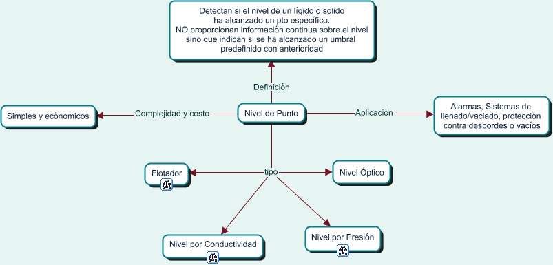 Este Cmap, tiene información relacionada con: Nivel de Punto, Nivel de Punto tipo Nivel Óptico, Nivel de Punto Definición Detectan si el nivel de un líqido o solido ha alcanzado un pto específico. NO proporcionan información continua sobre el nivel sino que indican si se ha alcanzado un umbral predefinido con anterioridad, Nivel de Punto tipo Flotador, Nivel de Punto tipo Nivel por Presión, Nivel de Punto Aplicación Alarmas, Sistemas de llenado/vaciado, protección contra desbordes o vacíos, Nivel de Punto tipo Nivel por Conductividad, Nivel de Punto Complejidad y costo Simples y ecónomicos