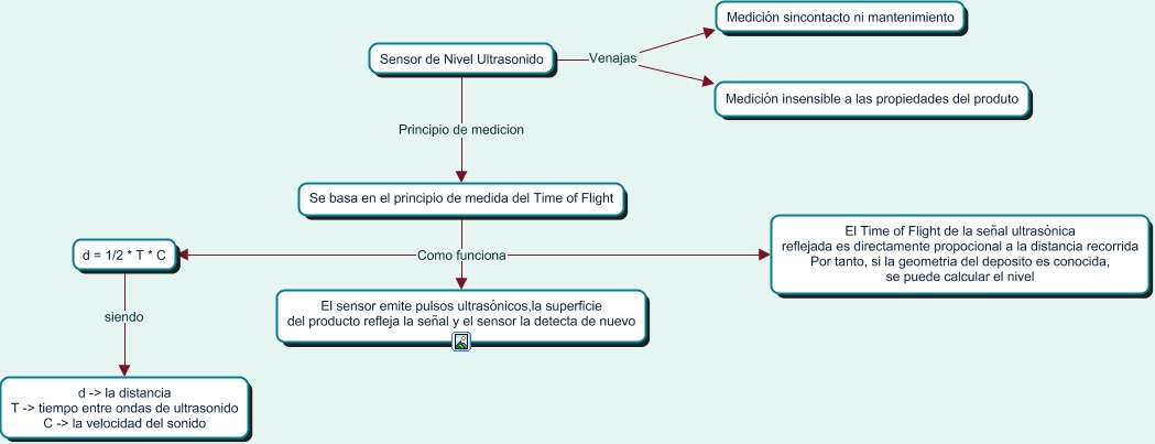Este Cmap, tiene información relacionada con: Sensor de Nivel Ultrasonido, Se basa en el principio de medida del Time of Flight Como funciona El Time of Flight de la señal ultrasónica reflejada es directamente propocional a la distancia recorrida Por tanto, si la geometria del deposito es conocida, se puede calcular el nivel, d = 1/2 * T * C siendo d -> la distancia T -> tiempo entre ondas de ultrasonido C -> la velocidad del sonido, Se basa en el principio de medida del Time of Flight Como funciona d = 1/2 * T * C, Sensor de Nivel Ultrasonido Principio de medicion Se basa en el principio de medida del Time of Flight, Se basa en el principio de medida del Time of Flight Como funciona El sensor emite pulsos ultrasónicos,la superficie del producto refleja la señal y el sensor la detecta de nuevo, Sensor de Nivel Ultrasonido Venajas Medición insensible a las propiedades del produto, Sensor de Nivel Ultrasonido Venajas Medición sincontacto ni mantenimiento