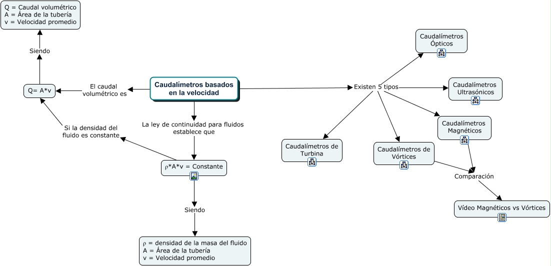 Este Cmap, tiene información relacionada con: Basados en la Velocidad, ρ*A*v = Constante Siendo ρ = densidad de la masa del fluido A = Área de la tubería v = Velocidad promedio, Caudalímetros basados en la velocidad Existen 5 tipos Caudalímetros Ópticos, Caudalímetros basados en la velocidad Existen 5 tipos Caudalímetros Magnéticos, Caudalímetros basados en la velocidad Existen 5 tipos Caudalímetros Ultrasónicos, Caudalímetros de Vórtices Comparación Vídeo Magnéticos vs Vórtices, Caudalímetros basados en la velocidad La ley de continuidad para fluidos establece que ρ*A*v = Constante, Q= A*v Siendo Q = Caudal volumétrico A = Área de la tubería v = Velocidad promedio, Caudalímetros basados en la velocidad El caudal volumétrico es Q= A*v, Caudalímetros Magnéticos Comparación Vídeo Magnéticos vs Vórtices, Caudalímetros basados en la velocidad Existen 5 tipos Caudalímetros de Turbina, Caudalímetros basados en la velocidad Existen 5 tipos Caudalímetros de Vórtices, ρ*A*v = Constante Si la densidad del fluido es constante Q= A*v