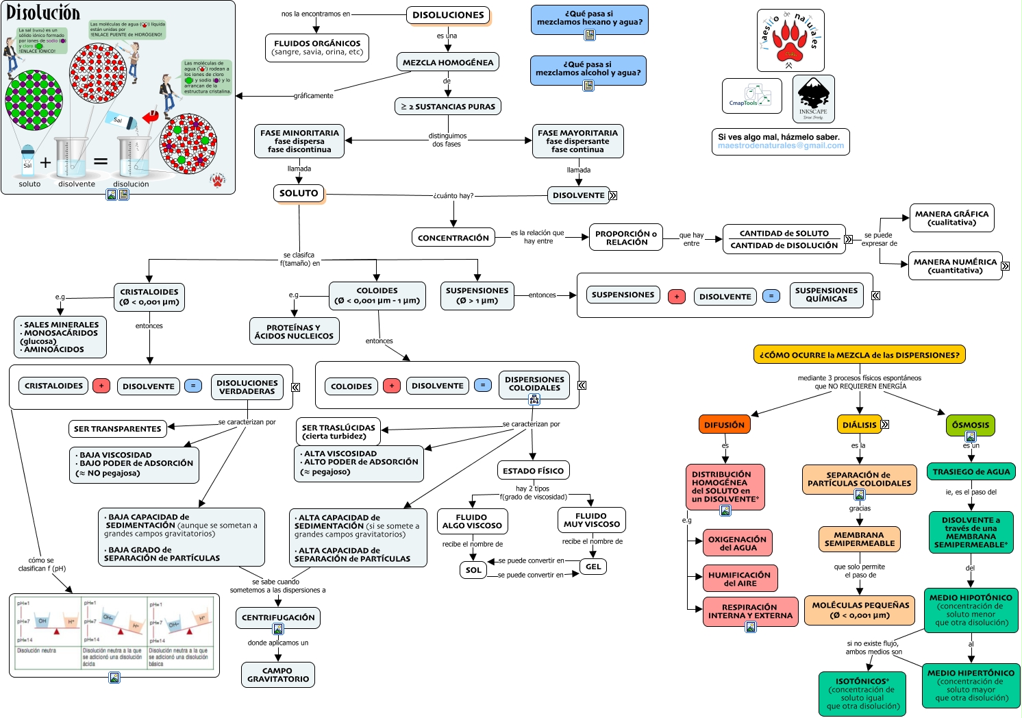 Este Cmap, tiene información relacionada con: 1.5.1 Dispersiones acuosas, MEDIO HIPERTÓNICO (concentración de soluto mayor que otra disolución) si no existe flujo, ambos medios son ISOTÓNICOS* (concentración de soluto igual que otra disolución), <math xmlns="http://www.w3.org/1998/Math/MathML"> <mrow> <mfrac> <mtext> CANTIDAD de SOLUTO </mtext> <mtext> CANTIDAD de DISOLUCIÓN </mtext> </mfrac> </mrow> </math> se expresa MOLARIDAD, DISTRIBUCIÓN HOMOGÉNEA del SOLUTO en un DISOLVENTE* e.g HUMIFICACIÓN del AIRE, MOLALIDAD i.e <math xmlns="http://www.w3.org/1998/Math/MathML"> <mrow> <mfenced open="(" close=")"> <mfrac> <mtext> moles de soluto </mtext> <mtext> kilogramos de disolución </mtext> </mfrac> </mfenced> <mtext> ×100 </mtext> </mrow> </math>, MEMBRANA SEMIPERMEABLE que permite el paso de MOLÉCULAS PEQUEÑAS (Ø < 0,001 μm), COLOIDES (Ø < 0,001 μm - 1 μm) entonces DISPERSIONES COLOIDALES, PORCENTAJE masa/masa i.e <math xmlns="http://www.w3.org/1998/Math/MathML"> <mrow> <mfenced open="(" close=")"> <mfrac> <mtext> masa de soluto </mtext> <mtext> masa de disolución </mtext> </mfrac> </mfenced> <mtext> ×100 </mtext> </mrow> </math>, SOLUTO se clasifca f(tamaño) en COLOIDES (Ø < 0,001 μm - 1 μm), DISTRIBUCIÓN HOMOGÉNEA del SOLUTO en un DISOLVENTE* e.g RESPIRACIÓN INTERNA Y EXTERNA, SOL se puede convertir en GEL, DISOLVENTES APOLARES presentan en su estructura molecular DISTRIBUCIÓN ASIMÉTRICA de la CARGA, DISOLVENTE (fase continua) se clasifican f(polaridad) DISOLVENTES POLARES, DISOLUCIONES VERDADERAS se caracterizan por · BAJA VISCOSIDAD · BAJO PODER de ADSORCIÓN (≈ NO pegajosa), <math xmlns="http://www.w3.org/1998/Math/MathML"> <mrow> <mfrac> <mtext> CANTIDAD de SOLUTO </mtext> <mtext> CANTIDAD de DISOLUCIÓN </mtext> </mfrac> </mrow> </math> se expresa PORCENTAJE masa/volumen, PROPORCIÓN o RELACIÓN que hay entre <math xmlns="http://www.w3.org/1998/Math/MathML"> <mrow> <mfrac> <mtext> CANTIDAD de SOLUTO </mtext> <mtext> CANTIDAD de DISOLUCIÓN </mtext> </mfrac> </mrow> </math>, MEZCLA HOMOGÉNEA gráficamente, DISOLUCIONES VERDADERAS cómo se clasifican f (pH), ≥ 2 SUSTANCIAS PURAS distinguimos dos fases FASE MINORITARIA fase dispersa fase discontinua, ¿CÓMO OCURRE la MEZCLA de las DISPERSIONES? mediante 3 procesos físicos espontáneos que NO REQUIEREN ENERGÍA DIFUSIÓN, SUSPENSIONES (Ø > 1 μm) entonces SUSPENSIONES QUÍMICAS