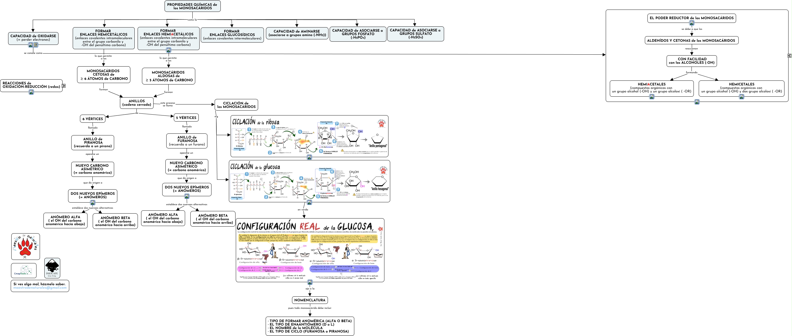 Este Cmap, tiene información relacionada con: 2.2.2 Propiedades químicas de los monosacáridos, CICLACIÓN de los MONOSACÁRIDOS e.g, OXIDACIÓN (= pérdida de electrones) significa PÉRDIDA de HIDRÓGENO -en la molécula-, PROCESO QUÍMICO que consiste en INTERCAMBIO de ELECTRONES, INTERCAMBIO de ELECTRONES hay dos maneras no excluyentes OXIDACIÓN (= pérdida de electrones), ojo a la NOMENCLATURA, PROPIEDADES QUÍMICAS de los MONOSACÁRIDOS como la CAPACIDAD de ASOCIARSE a GRUPOS FOSFATO (-H2PO4), PROPIEDADES QUÍMICAS de los MONOSACÁRIDOS como la FORMAR ENLACES HEMIACETÁLICOS (enlaces covalentes intramoleculares entre el grupo carbonilo y -OH del penúltimo carbono), PROPIEDADES QUÍMICAS de los MONOSACÁRIDOS como la CAPACIDAD de ASOCIARSE a GRUPOS SULFATO (-H2SO4), CICLACIÓN de los MONOSACÁRIDOS e.g, MONOSACÁRIDOS CETOSAS de ≥ 6 ÁTOMOS de CARBONO forman ANILLOS (cadena cerrada), CON FACILIDAD con los ALCOHOLES (-OH) formando HEMIACETALES (compuestos orgánicos con un grupo alcohol (-OH) y un grupo alcoloxi ( -OR), ANILLO de PIRANOSA (recuerda a un pirano) aparece un NUEVO CARBONO ASIMÉTRICO (= carbono anomérico), CAPACIDAD de OXIDARSE (= perder electrones) se conoce como EL PODER REDUCTOR de los MONOSACÁRIDOS, NUEVO CARBONO ASIMÉTRICO (= carbono anomérico) que da origen a DOS NUEVOS EPÍMEROS (= ANÓMEROS), 6 VÉRTICES llamado ANILLO de PIRANOSA (recuerda a un pirano), PROPIEDADES QUÍMICAS de los MONOSACÁRIDOS como la CAPACIDAD de OXIDARSE (= perder electrones), DOS NUEVOS EPÍMEROS (= ANÓMEROS) establece dos nuevoas alternativas ANÓMERO ALFA ( el OH del carbono anomérico hacia abajo), REDUCCIÓN (= ganancia de electrones) significa GANANCIA de HIDRÓGENO -en la molécula-, NOMENCLATURA pues todo monosacárido debe incluir · TIPO DE FORMAR ANOMÉRICA (ALFA O BETA) · EL TIPO DE ENAÁNTIÓMERO (D o L) · EL NOMBRE de la MOLÉCULA · EL TIPO DE CICLO (FURANOSA o PIRANOSA), PROPIEDADES QUÍMICAS de los MONOSACÁRIDOS como la CAPACIDAD de AMINARSE (asociarse a grupos amino (-NH2))