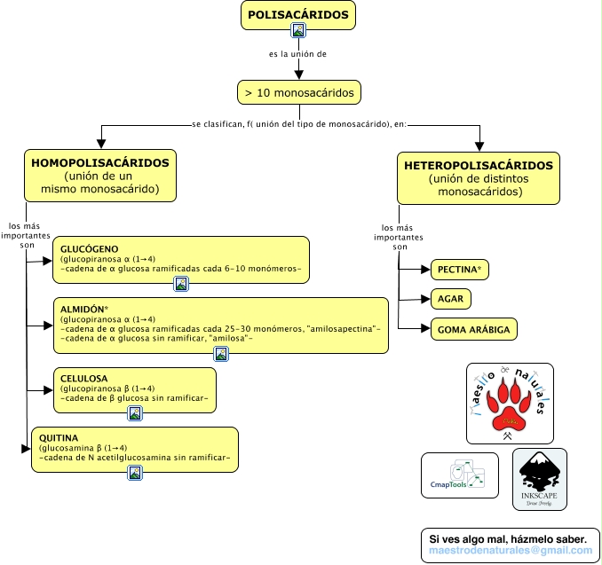Este Cmap, tiene información relacionada con: 2.5 Polisacáridos, HOMOPOLISACÁRIDOS (unión de un mismo monosacárido) los más importantes son QUITINA (glucosamina β (1→4) -cadena de N acetilglucosamina sin ramificar-, HOMOPOLISACÁRIDOS (unión de un mismo monosacárido) los más importantes son GLUCÓGENO (glucopiranosa α (1→4) -cadena de α glucosa ramificadas cada 6-10 monómeros-, HETEROPOLISACÁRIDOS (unión de distintos monosacáridos) los más importantes son AGAR, > 10 monosacáridos se clasifican, f( unión del tipo de monosacárido), en: HOMOPOLISACÁRIDOS (unión de un mismo monosacárido), HOMOPOLISACÁRIDOS (unión de un mismo monosacárido) los más importantes son CELULOSA (glucopiranosa β (1→4) -cadena de β glucosa sin ramificar-, HETEROPOLISACÁRIDOS (unión de distintos monosacáridos) los más importantes son GOMA ARÁBIGA, HETEROPOLISACÁRIDOS (unión de distintos monosacáridos) los más importantes son PECTINA*, HOMOPOLISACÁRIDOS (unión de un mismo monosacárido) los más importantes son ALMIDÓN* (glucopiranosa α (1→4) -cadena de α glucosa ramificadas cada 25-30 monómeros, "amilosapectina"- -cadena de α glucosa sin ramificar, "amilosa"-, POLISACÁRIDOS es la unión de > 10 monosacáridos, > 10 monosacáridos se clasifican, f( unión del tipo de monosacárido), en: HETEROPOLISACÁRIDOS (unión de distintos monosacáridos)