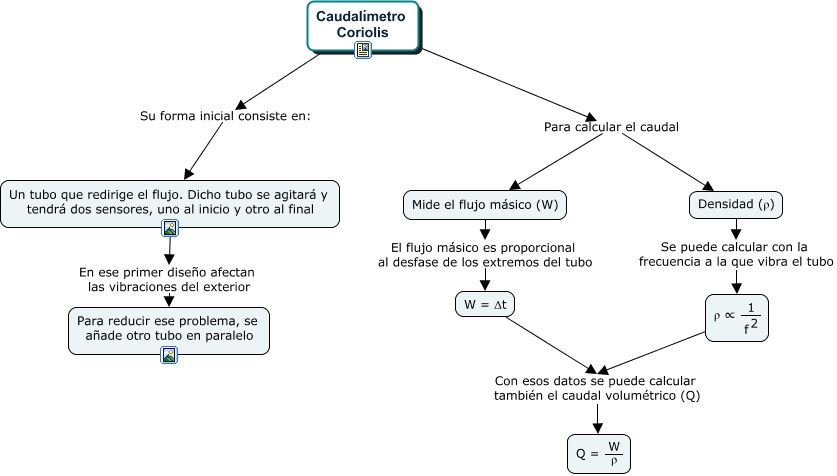 Este Cmap, tiene información relacionada con: Caudalímetro Coriolis, <math xmlns="http://www.w3.org/1998/Math/MathML"> <mrow> <mtext> ρ ∝ </mtext> <mfrac> <mtext> 1 </mtext> <mmultiscripts> <mtext> f </mtext> <none/> <mtext> 2 </mtext> </mmultiscripts> </mfrac> </mrow> </math> Con esos datos se puede calcular también el caudal volumétrico (Q) <math xmlns="http://www.w3.org/1998/Math/MathML"> <mrow> <mtext> Q = </mtext> <mfrac> <mtext> W </mtext> <mtext> ρ </mtext> </mfrac> </mrow> </math>, Un tubo que redirige el flujo. Dicho tubo se agitará y tendrá dos sensores, uno al inicio y otro al final En ese primer diseño afectan las vibraciones del exterior Para reducir ese problema, se añade otro tubo en paralelo, Caudalímetro Coriolis Para calcular el caudal Mide el flujo másico (W), Densidad (ρ) Se puede calcular con la frecuencia a la que vibra el tubo <math xmlns="http://www.w3.org/1998/Math/MathML"> <mrow> <mtext> ρ ∝ </mtext> <mfrac> <mtext> 1 </mtext> <mmultiscripts> <mtext> f </mtext> <none/> <mtext> 2 </mtext> </mmultiscripts> </mfrac> </mrow> </math>, Mide el flujo másico (W) El flujo másico es proporcional al desfase de los extremos del tubo W = Δt, Caudalímetro Coriolis Para calcular el caudal Densidad (ρ), W = Δt Con esos datos se puede calcular también el caudal volumétrico (Q) <math xmlns="http://www.w3.org/1998/Math/MathML"> <mrow> <mtext> Q = </mtext> <mfrac> <mtext> W </mtext> <mtext> ρ </mtext> </mfrac> </mrow> </math>, Caudalímetro Coriolis Su forma inicial consiste en: Un tubo que redirige el flujo. Dicho tubo se agitará y tendrá dos sensores, uno al inicio y otro al final