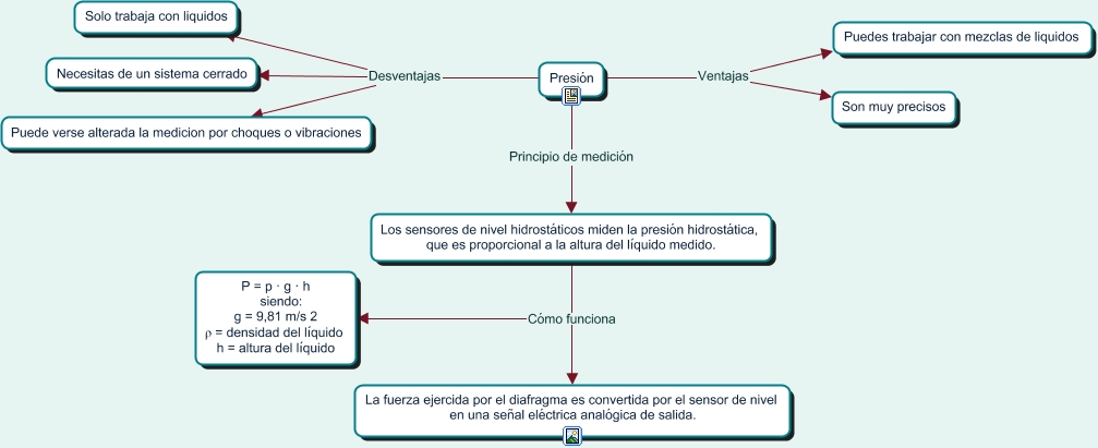 Este Cmap, tiene información relacionada con: Sensor de Nivel Presión, Presión Ventajas Son muy precisos, Presión Desventajas Puede verse alterada la medicion por choques o vibraciones, Presión Principio de medición Los sensores de nivel hidrostáticos miden la presión hidrostática, que es proporcional a la altura del líquido medido., Los sensores de nivel hidrostáticos miden la presión hidrostática, que es proporcional a la altura del líquido medido. Cómo funciona La fuerza ejercida por el diafragma es convertida por el sensor de nivel en una señal eléctrica analógica de salida., Presión Desventajas Solo trabaja con liquidos, Los sensores de nivel hidrostáticos miden la presión hidrostática, que es proporcional a la altura del líquido medido. Cómo funciona P = p · g · h siendo: g = 9,81 m/s 2 ρ = densidad del líquido h = altura del líquido, Presión Desventajas Necesitas de un sistema cerrado, Presión Ventajas Puedes trabajar con mezclas de liquidos
