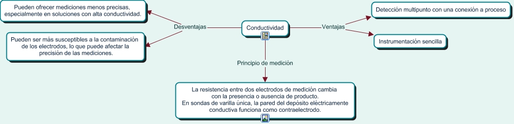 Este Cmap, tiene información relacionada con: Sensor de Nivel Conductivo, Conductividad Principio de medición La resistencia entre dos electrodos de medición cambia con la presencia o ausencia de producto. En sondas de varilla única, la pared del depósito eléctricamente conductiva funciona como contraelectrodo., Conductividad Ventajas Instrumentación sencilla, Conductividad Desventajas Pueden ofrecer mediciones menos precisas, especialmente en soluciones con alta conductividad., Conductividad Ventajas Detección multipunto con una conexión a proceso, Conductividad Desventajas Pueden ser más susceptibles a la contaminación de los electrodos, lo que puede afectar la precisión de las mediciones.