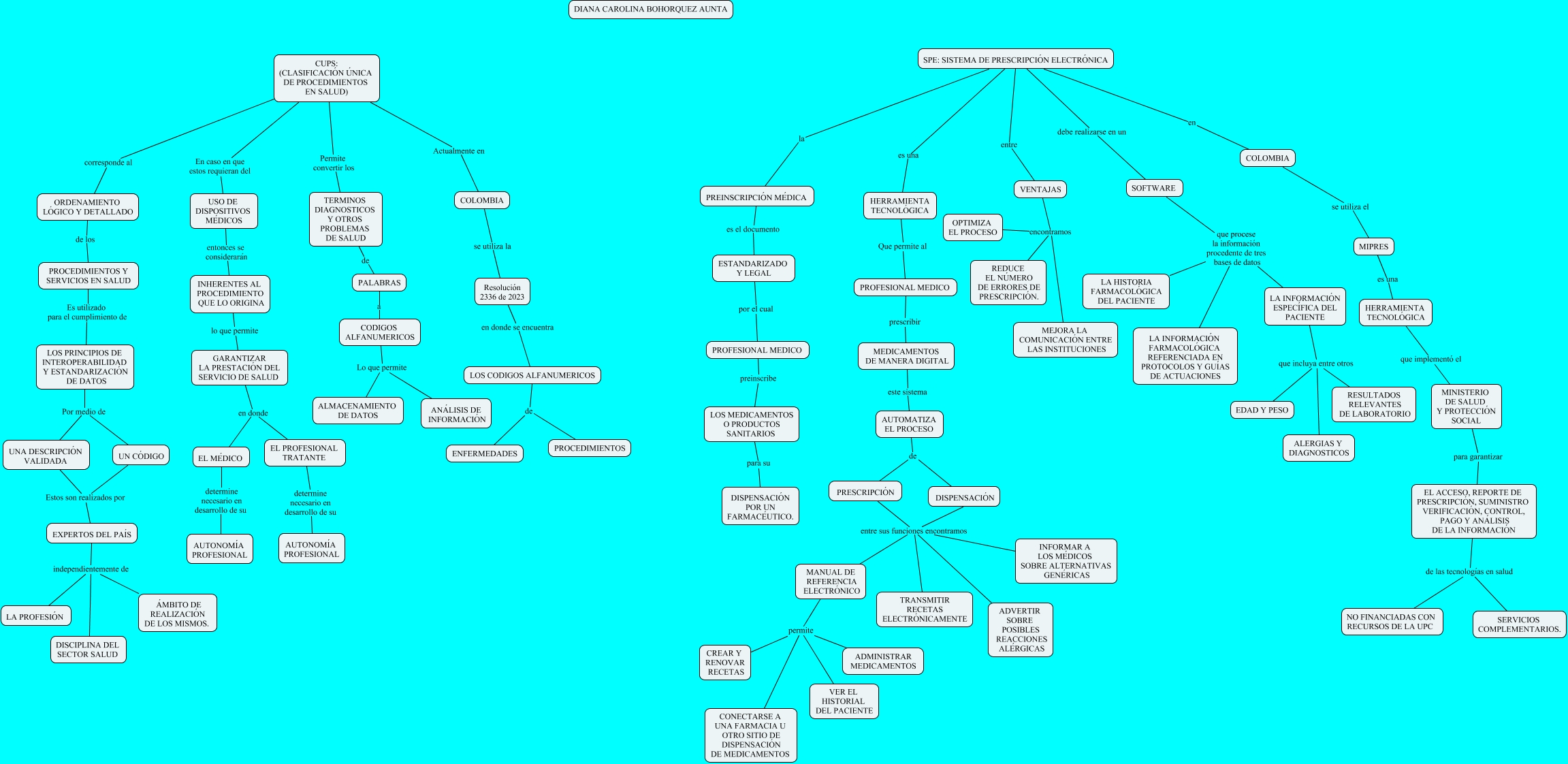 Este Cmap, tiene información relacionada con: teleS, DISPENSACIÓN entre sus funciones encontramos TRANSMITIR RECETAS ELECTRÓNICAMENTE, CUPS: (CLASIFICACIÓN ÚNICA DE PROCEDIMIENTOS EN SALUD) Actualmente en COLOMBIA, SPE: SISTEMA DE PRESCRIPCIÓN ELECTRÓNICA en COLOMBIA, VENTAJAS encontramos OPTIMIZA EL PROCESO, EL ACCESO, REPORTE DE PRESCRIPCIÓN, SUMINISTRO VERIFICACIÓN, CONTROL, PAGO Y ANÁLISIS DE LA INFORMACIÓN de las tecnologías en salud NO FINANCIADAS CON RECURSOS DE LA UPC, LOS CODIGOS ALFANUMERICOS de PROCEDIMIENTOS, SOFTWARE que procese la información procedente de tres bases de datos LA INFORMACIÓN ESPECÍFICA DEL PACIENTE, PROCEDIMIENTOS Y SERVICIOS EN SALUD Es utilizado para el cumplimiento de LOS PRINCIPIOS DE INTEROPERABILIDAD Y ESTANDARIZACIÓN DE DATOS, MANUAL DE REFERENCIA ELECTRÓNICO permite ADMINISTRAR MEDICAMENTOS, AUTOMATIZA EL PROCESO de PRESCRIPCIÓN, LOS MEDICAMENTOS O PRODUCTOS SANITARIOS para su DISPENSACIÓN POR UN FARMACÉUTICO., MANUAL DE REFERENCIA ELECTRÓNICO permite CONECTARSE A UNA FARMACIA U OTRO SITIO DE DISPENSACIÓN DE MEDICAMENTOS, DISPENSACIÓN entre sus funciones encontramos MANUAL DE REFERENCIA ELECTRÓNICO, DISPENSACIÓN entre sus funciones encontramos ADVERTIR SOBRE POSIBLES REACCIONES ALÉRGICAS, SPE: SISTEMA DE PRESCRIPCIÓN ELECTRÓNICA debe realizarse en un SOFTWARE, EXPERTOS DEL PAÍS independientemente de LA PROFESIÓN, EL MÉDICO determine necesario en desarrollo de su AUTONOMÍA PROFESIONAL, SOFTWARE que procese la información procedente de tres bases de datos LA INFORMACIÓN FARMACOLÓGICA REFERENCIADA EN PROTOCOLOS Y GUÍAS DE ACTUACIONES, Resolución 2336 de 2023 en donde se encuentra LOS CODIGOS ALFANUMERICOS, GARANTIZAR LA PRESTACIÓN DEL SERVICIO DE SALUD en donde EL PROFESIONAL TRATANTE