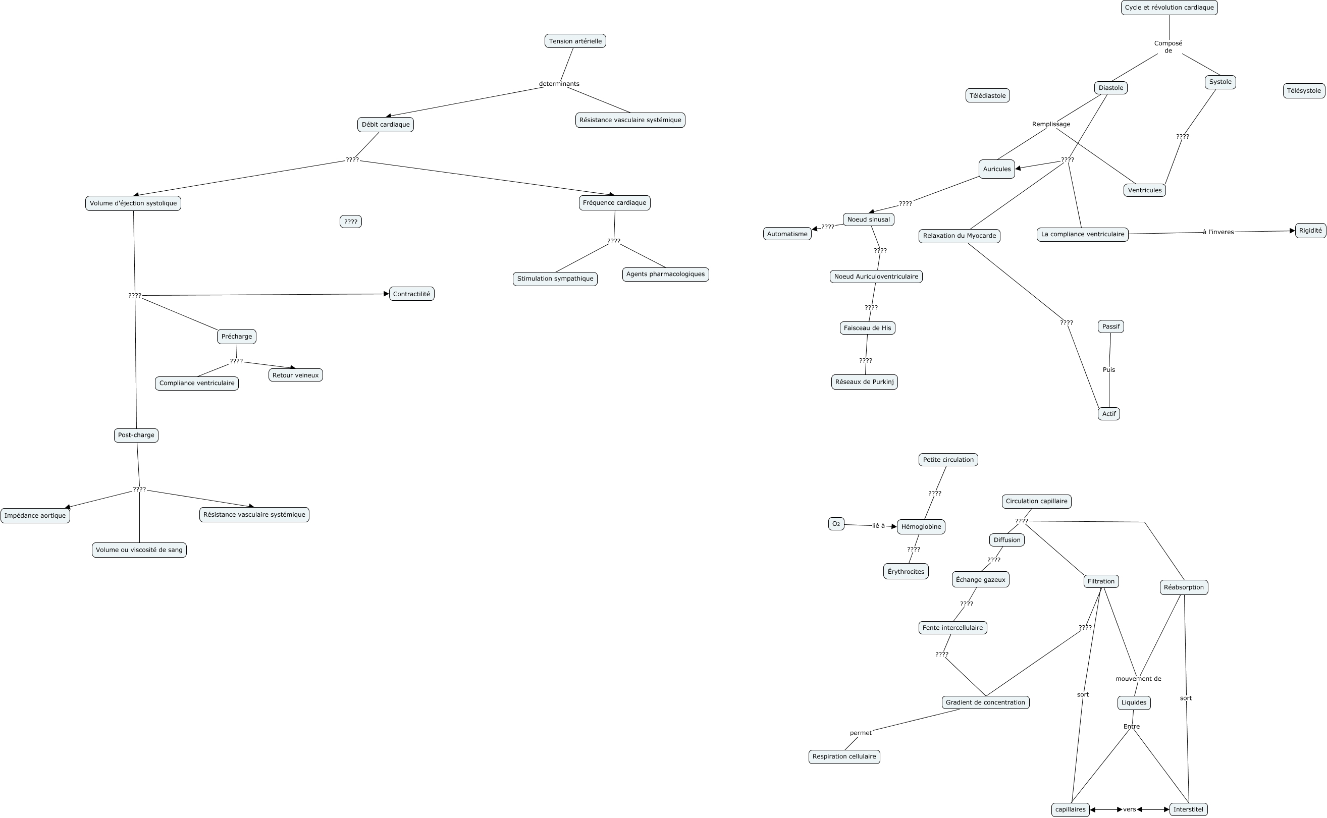 Cette carte de concepts créée avec IHMC CmapTools traite de: Système Cardiovasculaire, Tension artérielle determinants Résistance vasculaire systémique, Filtration ???? Gradient de concentration, Auricules ???? Noeud sinusal, Diastole ???? Auricules, Cycle et révolution cardiaque Composé de Diastole, Débit cardiaque ???? Fréquence cardiaque, Petite circulation ???? Hémoglobine, Gradient de concentration permet Respiration cellulaire, La compliance ventriculaire à l'inveres Rigidité, Circulation capillaire ???? Diffusion, Débit cardiaque ???? Volume d'éjection systolique, Diastole ???? Relaxation du Myocarde, Interstitel vers capillaires, Post-charge ???? Volume ou viscosité de sang, Échange gazeux ???? Fente intercellulaire, Diastole ???? La compliance ventriculaire, Noeud sinusal ???? Automatisme, Réabsorption sort Interstitel, Fréquence cardiaque ???? Stimulation sympathique, Faisceau de His ???? Réseaux de Purkinj