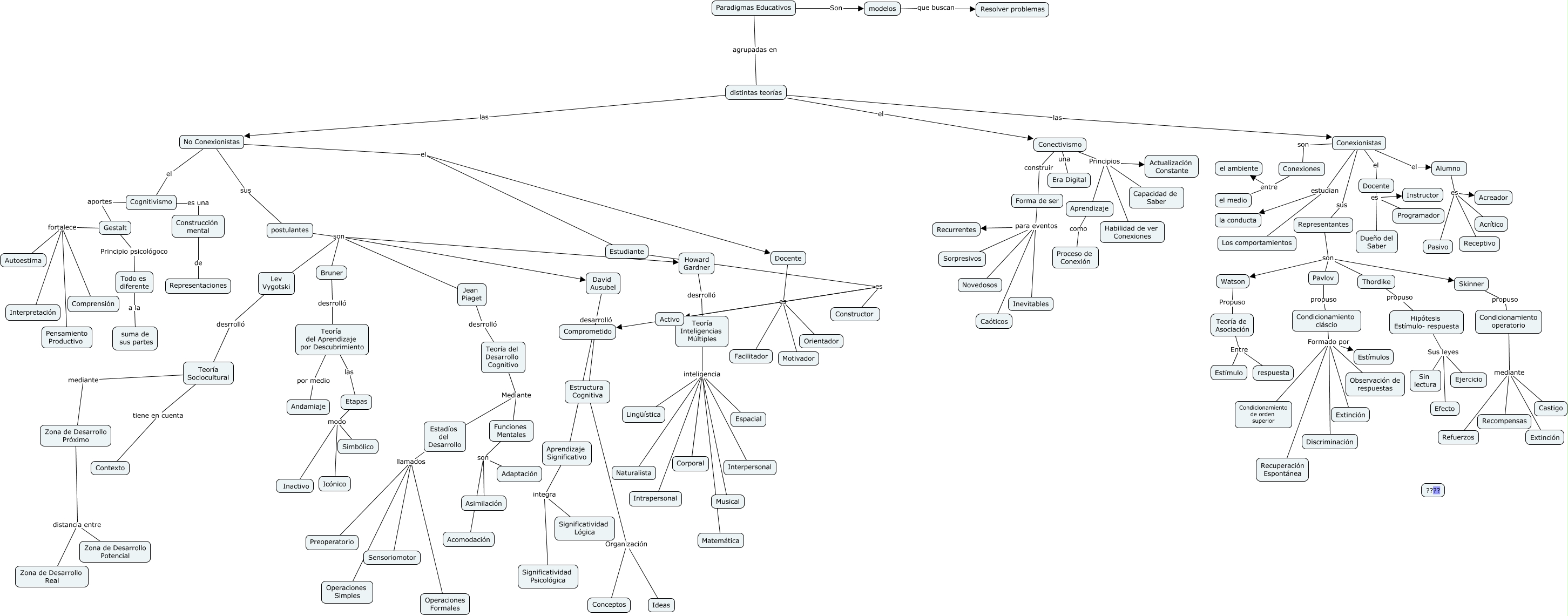 Este Cmap, tiene información relacionada con: Mapa paradigmas, Estudiante es Activo, Aprendizaje como Proceso de Conexión, Alumno es Pasivo, Conexionistas son Conexiones, Etapas modo Simbólico, David Ausubel desarrolló Estructura Cognitiva, Funciones Mentales son Acomodación, Teoría de Asociación Entre Estímulo, Todo es diferente a la suma de sus partes, Docente es Programador, Condicionamiento cláscio Formado por Observación de respuestas, Docente es Motivador, postulantes son David Ausubel, Estudiante es Constructor, Howard Gardner desrrolló Teoría Inteligencias Múltiples, Hipótesis Estímulo- respuesta Sus leyes Efecto, Representantes son Skinner, No Conexionistas el Estudiante, Zona de Desarrollo Próximo distancia entre Zona de Desarrollo Real, Representantes son Watson