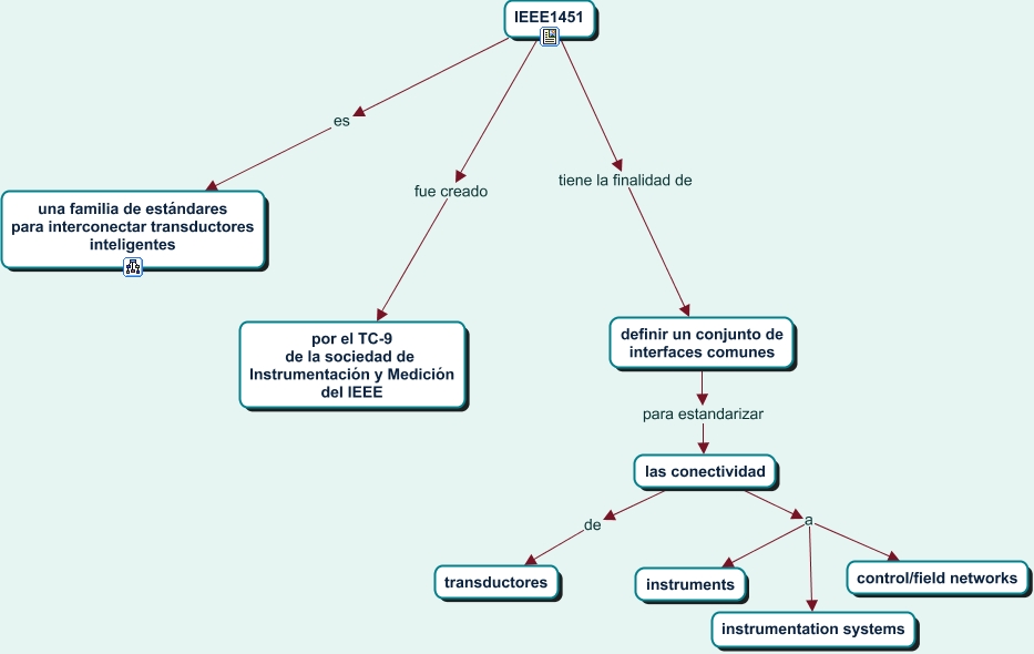 Este Cmap, tiene información relacionada con: 2 IEEE1451, las conectividad de transductores, definir un conjunto de interfaces comunes para estandarizar las conectividad, las conectividad a control/field networks, IEEE1451 tiene la finalidad de definir un conjunto de interfaces comunes, IEEE1451 fue creado por el TC-9 de la sociedad de Instrumentación y Medición del IEEE, las conectividad a instruments, IEEE1451 es una familia de estándares para interconectar transductores inteligentes, las conectividad a instrumentation systems
