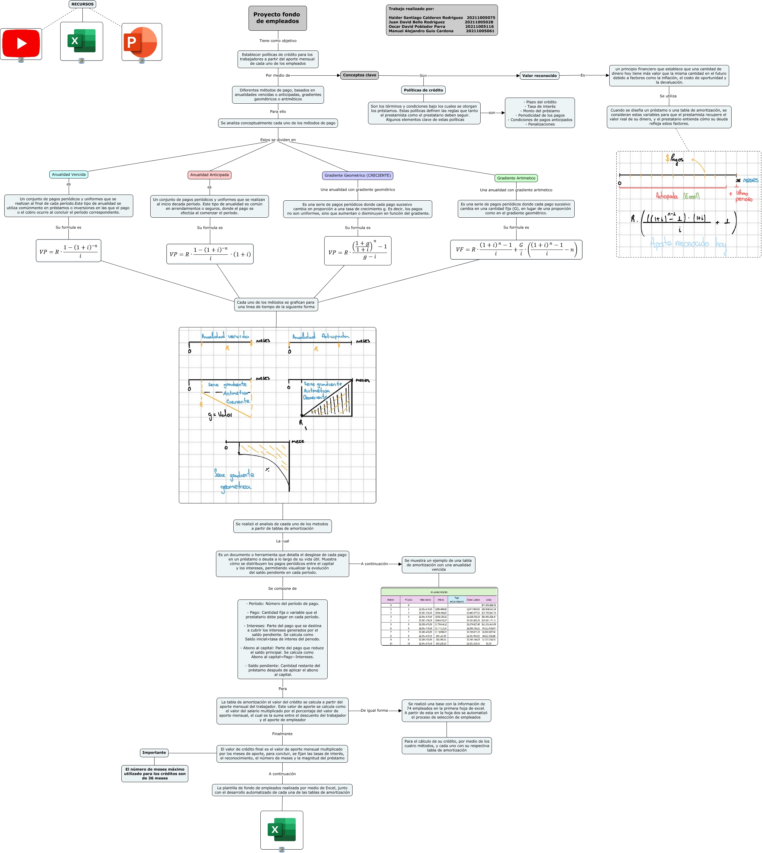 Este Cmap, tiene información relacionada con: Proyecto, ???? Cada uno de los métodos se grafican para una linea de tiempo de la siguiente forma, Cada uno de los métodos se grafican para una linea de tiempo de la siguiente forma ????, Conceptos clave Son Políticas de crédito, Se realizó una base con la información de 74 empleados en la primera hoja de excel. A partir de esta en la hoja dos se automatizó el proceso de selección de empleados ???? Para el cálculo de su crédito, por medio de los cuatro métodos, y cada uno con su respectiva tabla de amortización, Políticas de crédito ???? Son los términos y condiciones bajo los cuales se otorgan los préstamos. Estas políticas definen las reglas que tanto el prestamista como el prestatario deben seguir. Algunos elementos clave de estas políticas, Anualidad Vencida Estos se dividen en Anualidad Anticipada, Diferentes métodos de pago, basados en anualidades vencidas o anticipadas, gradientes geométricos o aritméticos Para ello Se analiza conceptualmente cada uno de los métodos de pago, La tabla de amortización el valor del crédito se calcula a partir del aporte mensual del trabajador. Este valor de aporte se calcula como el valor del salario multiplicado por el porcentaje del valor de aporte mensual, el cual es la suma entre el descuento del trabajador y el aporte de empleador Finalmente El valor de crédito final es el valor de aporte mensual multiplicado por los meses de aporte, para concluir, se fijan las tasas de interés, el reconocimiento, el número de meses y la magnitud del préstamo, Valor reconocido Es un principio financiero que establece que una cantidad de dinero hoy tiene más valor que la misma cantidad en el futuro debido a factores como la inflación, el costo de oportunidad y la devaluación., Importante ???? El número de meses máximo utilizado para los créditos son de 36 meses, RECURSOS ????, Importante ???? El valor de crédito final es el valor de aporte mensual multiplicado por los meses de aporte, para concluir, se fijan las tasas de interés, el reconocimiento, el número de meses y la magnitud del préstamo, - Período: Número del período de pago. - Pago: Cantidad fija o variable que el prestatario debe pagar en cada período. - Intereses: Parte del pago que se destina a cubrir los intereses generados por el saldo pendiente. Se calcula como Saldo inicial×tasa de interes del perıodo. - Abono al capital: Parte del pago que reduce el saldo principal. Se calcula como Abono al capital=Pago−Intereses. - Saldo pendiente: Cantidad restante del préstamo después de aplicar el abono al capital. Para La tabla de amortización el valor del crédito se calcula a partir del aporte mensual del trabajador. Este valor de aporte se calcula como el valor del salario multiplicado por el porcentaje del valor de aporte mensual, el cual es la suma entre el descuento del trabajador y el aporte de empleador, Anualidad Anticipada es Un conjunto de pagos periódicos y uniformes que se realizan al inicio decada período. Este tipo de anualidad es común en arrendamientos o seguros, donde el pago se efectúa al comenzar el período., ???? Cada uno de los métodos se grafican para una linea de tiempo de la siguiente forma, un principio financiero que establece que una cantidad de dinero hoy tiene más valor que la misma cantidad en el futuro debido a factores como la inflación, el costo de oportunidad y la devaluación. Se utiliza Cuando se diseña un préstamo o una tabla de amortización, se consideran estas variables para que el prestamista recupere el valor real de su dinero, y el prestatario entienda cómo su deuda refleja estos factores., La plantilla de fondo de empleados realizada por medio de Excel, junto con el desarrollo automatizado de cada una de las tablas de amortización ????, Es una serie de pagos periódicos donde cada pago sucesivo cambia en una cantidad fija (G), en lugar de una proporción como en el gradiente geométrico. Su formula es, Es un documento o herramienta que detalla el desglose de cada pago en un préstamo o deuda a lo largo de su vida útil. Muestra cómo se distribuyen los pagos periódicos entre el capital y los intereses, permitiendo visualizar la evolución del saldo pendiente en cada período. Se compone de - Período: Número del período de pago. - Pago: Cantidad fija o variable que el prestatario debe pagar en cada período. - Intereses: Parte del pago que se destina a cubrir los intereses generados por el saldo pendiente. Se calcula como Saldo inicial×tasa de interes del perıodo. - Abono al capital: Parte del pago que reduce el saldo principal. Se calcula como Abono al capital=Pago−Intereses. - Saldo pendiente: Cantidad restante del préstamo después de aplicar el abono al capital., Es una serie de pagos periódicos donde cada pago sucesivo cambia en proporción a una tasa de crecimiento g. Es decir, los pagos no son uniformes, sino que aumentan o disminuyen en función del gradiente. Su formula es