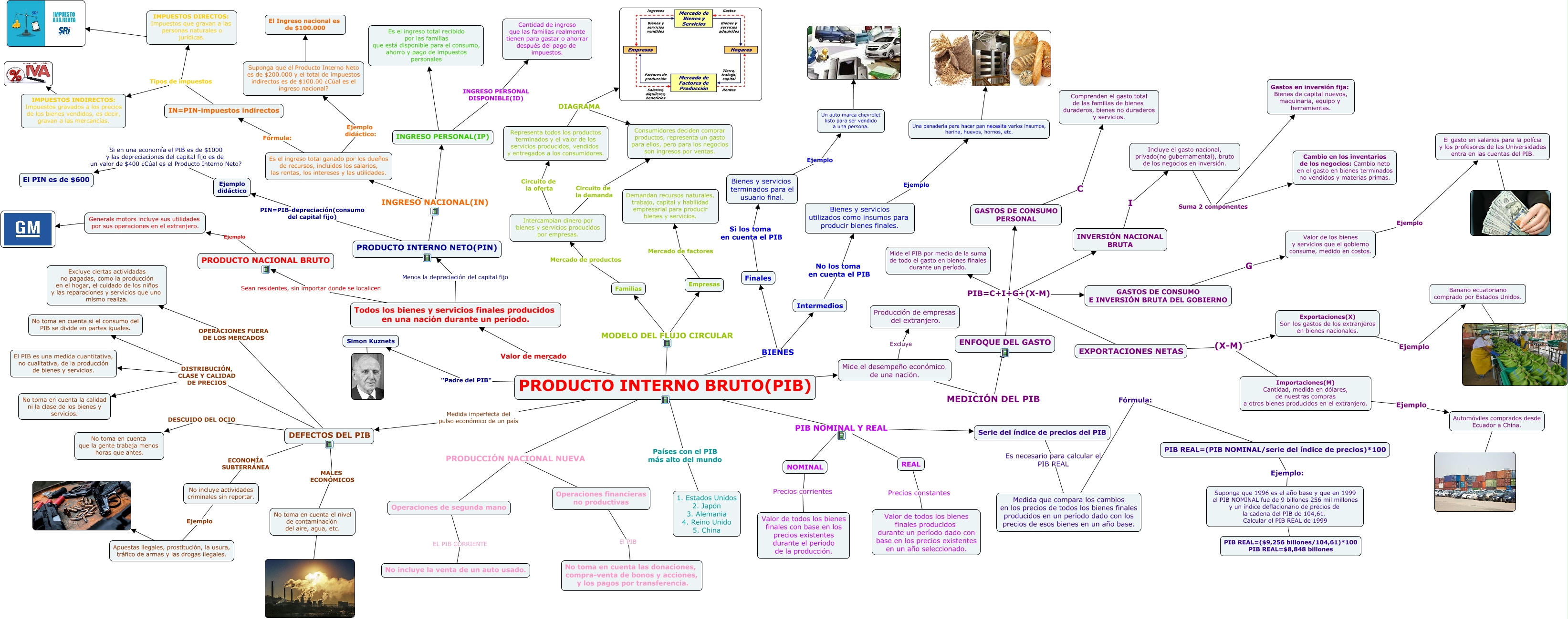 Este Cmap, tiene información relacionada con: PRODUCTO INTERNO BRUTO, Familias Mercado de productos Intercambian dinero por bienes y servicios producidos por empresas., ENFOQUE DEL GASTO PIB=C+I+G+(X-M) GASTOS DE CONSUMO E INVERSIÓN BRUTA DEL GOBIERNO, IN=PIN-impuestos indirectos Tipos de impuestos IMPUESTOS INDIRECTOS: Impuestos gravados a los precios de los bienes vendidos, es decir, gravan a las mercancías., Incluye el gasto nacional, privado(no gubernamental), bruto de los negocios en inversión. Suma 2 componentes Cambio en los inventarios de los negocios: Cambio neto en el gasto en bienes terminados no vendidos y materias primas., Bienes y servicios terminados para el usuario final. Ejemplo Un auto marca chevrolet listo para ser vendido a una persona., IN=PIN-impuestos indirectos Tipos de impuestos IMPUESTOS DIRECTOS: Impuestos que gravan a las personas naturales o jurídicas., Importaciones(M) Cantidad, medida en dólares, de nuestras compras a otros bienes producidos en el extranjero. Ejemplo Automóviles comprados desde Ecuador a China., PRODUCTO INTERNO BRUTO(PIB) Medida imperfecta del pulso económico de un país DEFECTOS DEL PIB, DEFECTOS DEL PIB DISTRIBUCIÓN, CLASE Y CALIDAD DE PRECIOS No toma en cuenta la calidad ni la clase de los bienes y servicios., Incluye el gasto nacional, privado(no gubernamental), bruto de los negocios en inversión. Suma 2 componentes Gastos en inversión fija: Bienes de capital nuevos, maquinaria, equipo y herramientas., Intercambian dinero por bienes y servicios producidos por empresas. Circuito de la oferta Representa todos los productos terminados y el valor de los servicios producidos, vendidos y entregados a los consumidores., EXPORTACIONES NETAS (X-M) Exportaciones(X) Son los gastos de los extranjeros en bienes nacionales., INGRESO PERSONAL(IP) Es el ingreso total recibido por las familias que está disponible para el consumo, ahorro y pago de impuestos personales, Es el ingreso total ganado por los dueños de recursos, incluidos los salarios, las rentas, los intereses y las utilidades. Fórmula: IN=PIN-impuestos indirectos, Banano ecuatoriano comprado por Estados Unidos. ????, PRODUCTO INTERNO NETO(PIN) PIN=PIB-depreciación(consumo del capital fijo) Ejemplo didáctico, Operaciones de segunda mano EL PIB CORRIENTE No incluye la venta de un auto usado., Exportaciones(X) Son los gastos de los extranjeros en bienes nacionales. Ejemplo Banano ecuatoriano comprado por Estados Unidos., Serie del índice de precios del PIB Es necesario para calcular el PIB REAL Medida que compara los cambios en los precios de todos los bienes finales producidos en un período dado con los precios de esos bienes en un año base., PRODUCTO INTERNO BRUTO(PIB) BIENES Finales