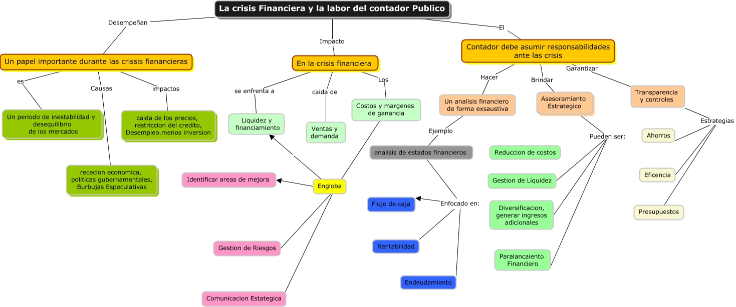 Este Cmap, tiene información relacionada con: Mapa Conceptual, La crisis Financiera y la labor del contador Publico El Contador debe asumir responsabilidades ante las crisis, La crisis Financiera y la labor del contador Publico Desempeñan Un papel importante durante las crissis fianancieras, En la crisis financiera se enfrenta a Liquidez y financiamiento, analisis de estados financieros Enfocado en: Flujo de caja, Transparencia y controles Estrategias Ahorros, Asesoramiento Estrategico Pueden ser: Gestion de Liquidez, analisis de estados financieros Enfocado en: Rentabilidad, Asesoramiento Estrategico Pueden ser: Diversificacion, generar ingresos adicionales, Un analisis financiero de forma exsaustiva Ejemplo analisis de estados financieros, analisis de estados financieros Enfocado en: Endeudamiento, Contador debe asumir responsabilidades ante las crisis Hacer Un analisis financiero de forma exsaustiva, Contador debe asumir responsabilidades ante las crisis Garantizar Transparencia y controles, Costos y margenes de ganancia ???? Identificar areas de mejora, Un papel importante durante las crissis fianancieras es Un periodo de inestabilidad y desequilibrio de los mercados, Engloba Liquidez y financiamiento, Asesoramiento Estrategico Pueden ser: Paralancaiento Financiero, Transparencia y controles Estrategias Presupuestos, La crisis Financiera y la labor del contador Publico Impacto En la crisis financiera, Transparencia y controles Estrategias Eficencia, Costos y margenes de ganancia ???? Comunicacion Estategica