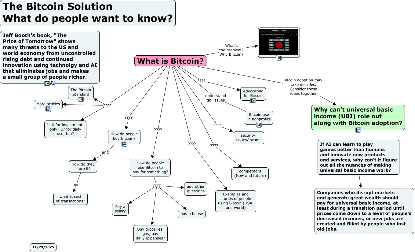 This Concept Map, created with IHMC CmapTools, has information related to: Bitcoin Questions and Resources, What is Bitcoin? ???? How do people buy Bitcoin?, How do people use Bitcoin to pay for something? ???? Buy groceries, gas, pay daily expenses?, What is Bitcoin? understand tax issues Bitcoin use in nonprofits, How do people use Bitcoin to pay for something? ???? buy a house, If AI can learn to play games better than humans and innovate new products and services, why can't it figure out all the nuances of making universal basic income work? ???? Companies who disrupt markets and generate great wealth should pay for universal basic income, at least during a transition period until prices come down to a level of people's decreased incomes, or new jobs are created and filled by people who lost old jobs., What is Bitcoin? ???? Examples and stories of people using Bitcoin (USA and world), What is Bitcoin? ???? The Bitcoin Standard, What is Bitcoin? ???? Is it for investment only? Or for daily use, too?, What is Bitcoin? Bitcoin adoption may take decades. Consider these ideas together Why can't universal basic income (UBI) role out along with Bitcoin adoption?, What is Bitcoin? What's the problem? Why Bitcoin?, What is Bitcoin? ???? How do people use Bitcoin to pay for something?, How do they store it? and what is cost of transactions?, What is Bitcoin? ???? security issues/ scams, How do people buy Bitcoin? and How do they store it?, What is Bitcoin? ???? More articles, What is Bitcoin? ???? Advocating for Bitcoin, What is Bitcoin? ???? competitors (Now and future), How do people use Bitcoin to pay for something? ???? Pay a salary, How do people use Bitcoin to pay for something? ???? add other questions
