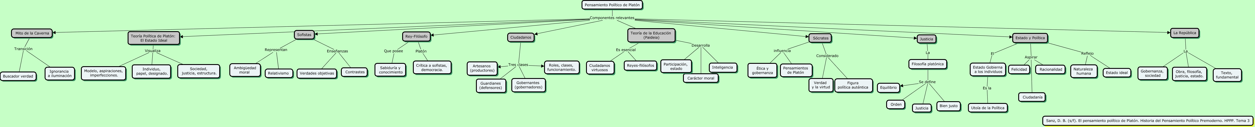 Este Cmap, tiene información relacionada con: Política educativa, Teoría de la Educación (Paideia) Es esencial Ciudadanos virtuosos, Teoría de la Educación (Paideia) Desarrolla Participación, estado, Estado y Política Reflejo Estado ideal, Estado y Política El Estado Gobierna a los individuos, Filosofía platónica Se define Orden, Mito de la Caverna Transición Buscador verdad, Sócrates Considerado Verdad y la virtud, Pensamiento Político de Platón Componentes relevantes Justicia, Sofistas Representan Ambigüedad moral, Filosofía platónica Se define Bien justo, Sofistas Representan Relativismo, Sócrates Considerado Figura política auténtica, Pensamiento Político de Platón Componentes relevantes Mito de la Caverna, Ciudadanos Tres clases Guardianes (defensores), Pensamiento Político de Platón Componentes relevantes Sofistas, Estado y Política Aspirar Racionalidad, Filosofía platónica Se define Equilibrio, Estado y Política Reflejo Naturaleza humana, Pensamiento Político de Platón Componentes relevantes Estado y Política, Pensamiento Político de Platón Componentes relevantes Teoría Política de Platón: El Estado Ideal