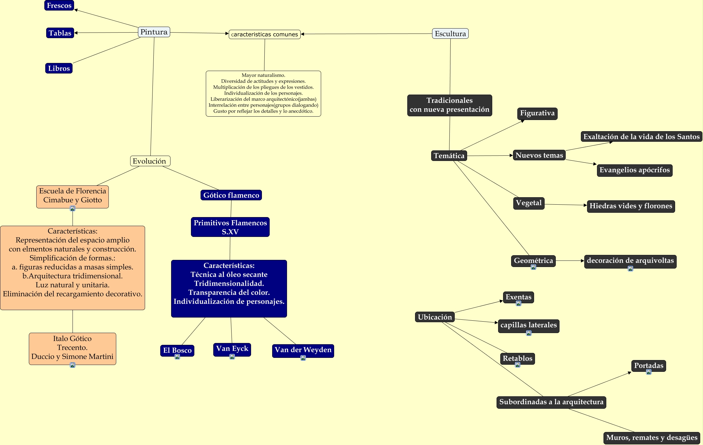 Este Cmap, tiene información relacionada con: pintura y escultura Gótica, Temática Figurativa, Características: Técnica al óleo secante Tridimensionalidad. Transparencia del color. Individualización de personajes. Van Eyck, Geométrica decoración de arquivoltas, Temática Nuevos temas, Características: Técnica al óleo secante Tridimensionalidad. Transparencia del color. Individualización de personajes. Van der Weyden, Temática Geométrica, Características: Técnica al óleo secante Tridimensionalidad. Transparencia del color. Individualización de personajes. El Bosco, Pintura Caracteristicas comunes, Pintura Libros, Pintura Frescos, Escultura Caracteristicas comunes, Ubicación capillas laterales, Primitivos Flamencos S.XV Características: Técnica al óleo secante Tridimensionalidad. Transparencia del color. Individualización de personajes., Ubicación Subordinadas a la arquitectura, Ubicación Exentas, Caracteristicas comunes Mayor naturalismo. Diversidad de actitudes y expresiones. Multiplicación de los pliegues de los vestidos. Individualización de los personajes. Liberarización del marco arquitectónico(jambas) Interrelación entre personajes(grupos dialogando) Gusto por reflejar los detalles y lo anecdótico., Evolución Gótico flamenco, Pintura Tablas, Escuela de Florencia Cimabue y Giotto Características: Representación del espacio amplio con elmentos naturales y construcción. Simplificación de formas.: a. figuras reducidas a masas simples. b.Arquitectura tridimensional. Luz natural y unitaria. Eliminación del recargamiento decorativo., Tradicionales con nueva presentación Temática