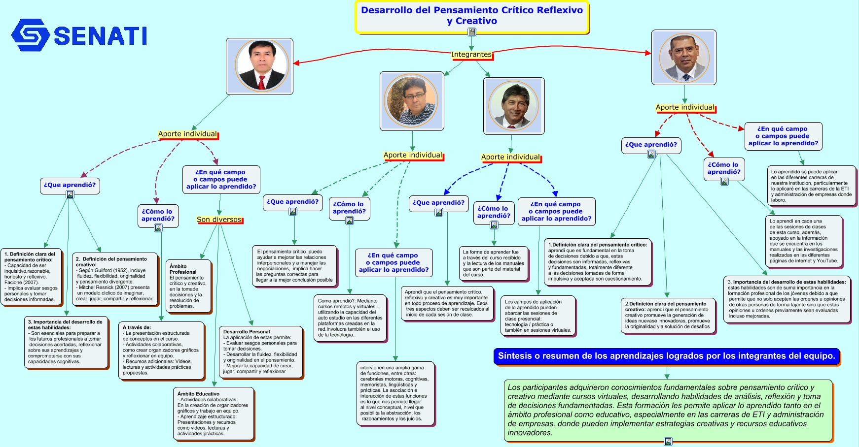 Este Cmap, tiene información relacionada con: Mapa mental-SENATI - 202510, ¿En qué campo o campos puede aplicar lo aprendido? ???? Los campos de aplicación de lo aprendido pueden abarcar las sesiones de clase presencial: tecnología / práctica o también en sesiones virtuales., Desarrollo del Pensamiento Crítico Reflexivo y Creativo Integrantes, Aporte individual ¿Cómo lo aprendió?, ¿Que aprendió? ???? 1. Definición clara del pensamiento crítico: - Capacidad de ser inquisitivo,razonable, honesto y reflexivo, Facione (2007). - Implica evaluar sesgos personales y tomar decisiones informadas., ¿Cómo lo aprendió? ???? La forma de aprender fue a través del curso recibido y la lectura de los manuales que son parte del material del curso., Desarrollo del Pensamiento Crítico Reflexivo y Creativo Integrantes, ¿En qué campo o campos puede aplicar lo aprendido? Son diversos Desarrollo Personal La aplicación de estas permite: - Evaluar sesgos personales para tomar decisiones. - Desarrollar la fluidez, flexibilidad y originalidad en el pensamiento. - Mejorar la capacidad de crear, jugar, compartir y reflexionar, Aporte individual ¿En qué campo o campos puede aplicar lo aprendido?, Aporte individual ¿En qué campo o campos puede aplicar lo aprendido?, Aporte individual ¿Que aprendió?, Aporte individual ¿En qué campo o campos puede aplicar lo aprendido?, ¿Que aprendió? ???? 3. Importancia del desarrollo de estas habilidades: estas habilidades son de suma importancia en la formación profesional de los jóvenes debido a que permite que no solo acepten las ordenes u opiniones de otras personas de forma tajante sino que estas opiniones u ordenes previamente sean evaluadas incluso mejoradas., ¿En qué campo o campos puede aplicar lo aprendido? Son diversos Ámbito Profesional El pensamiento crítico y creativo, en la tomade decisiones y la resolución de problemas., ¿Que aprendió? ???? Aprendí que el pensamiento crítico, reflexivo y creativo es muy importante en todo proceso de aprendizaje. Esos tres aspectos deben ser recalcados al inicio de cada sesión de clase., ¿Que aprendió? ???? 2.Definición clara del pensamiento creativo: aprendí que el pensamiento creativo promueve la generación de ideas nuevase innovadoras, promueve la originalidad yla solución de desafíos, ¿En qué campo o campos puede aplicar lo aprendido? ???? intervienen una amplia gama de funciones, entre otras: cerebrales motoras, cognitivas, memoristas, lingüísticas y prácticas. La asociación e interacción de estas funciones es lo que nos permite llegar al nivel conceptual, nivel que posibilita la abstracción, los razonamientos y los juicios., Desarrollo del Pensamiento Crítico Reflexivo y Creativo Integrantes, Aporte individual ¿Cómo lo aprendió?, Síntesis o resumen de los aprendizajes logrados por los integrantes del equipo. ???? Los participantes adquirieron conocimientos fundamentales sobre pensamiento crítico y creativo mediante cursos virtuales, desarrollando habilidades de análisis, reflexión y toma de decisiones fundamentadas. Esta formación les permite aplicar lo aprendido tanto en el ámbito profesional como educativo, especialmente en las carreras de ETI y administración de empresas, donde pueden implementar estrategias creativas y recursos educativos innovadores., ¿Que aprendió? ???? 3. Importancia del desarrollo de estas habilidades: - Son esenciales para preparar a los futuros profesionales a tomar decisiones acertadas, reflexionar sobre sus aprendizajes y comprometerse con sus capacidades cognitivas.
