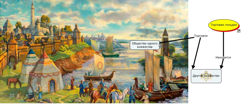 This Concept Map, created with IHMC CmapTools, has information related to: Организация, Торговая гильдия Находится Другое княжество, Князь Закупает Снаряжение, Князь Управляет Княжество, Общество одного княжества Торговля Другое княжество, Дружина Служит Князь, Крестьяне Подчиняются Князь, Дружина Имеет Снаряжение, Дружина Защищает Княжество, Крестьяне Проживают Княжество