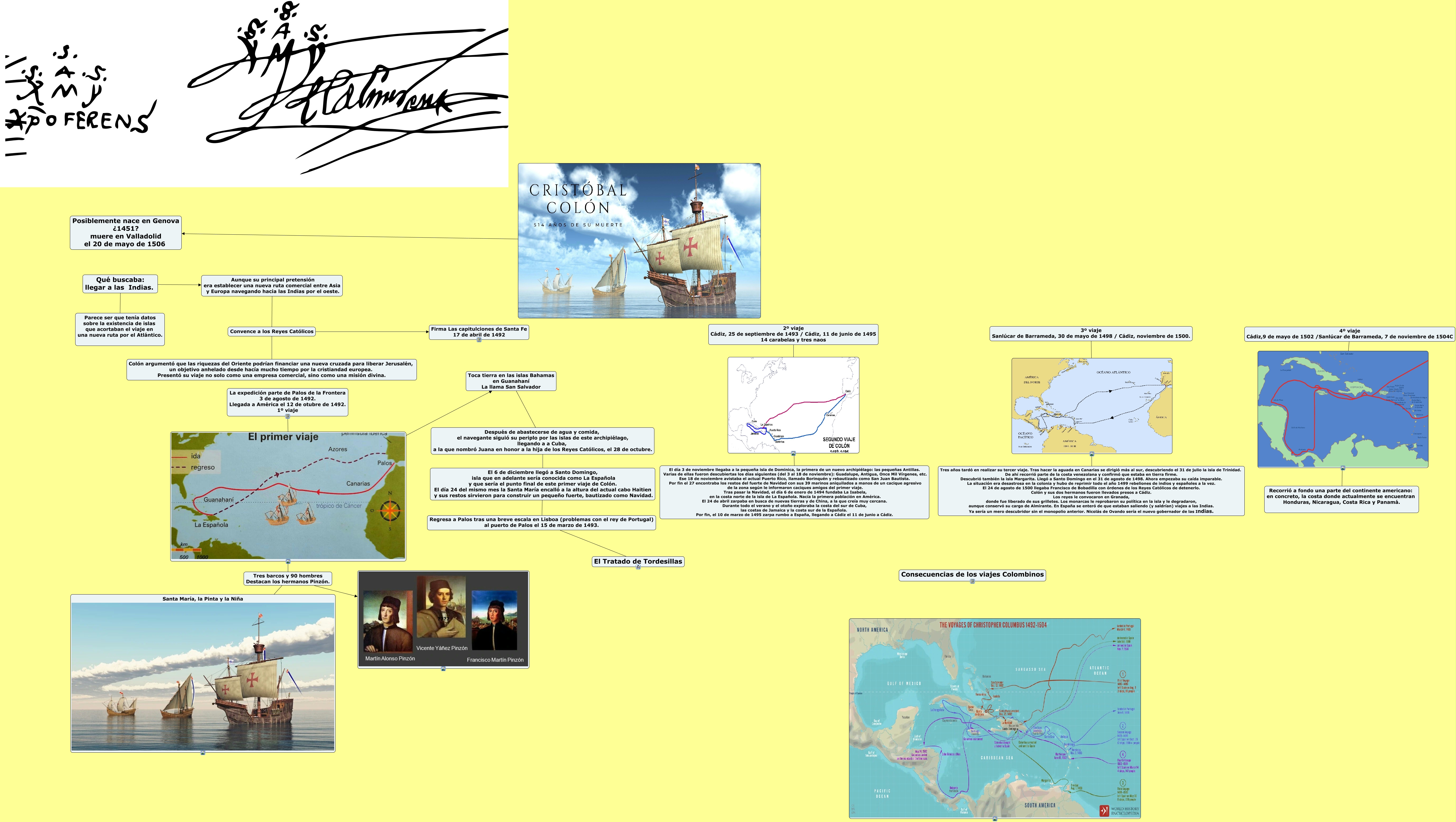 Este Cmap, tiene información relacionada con: Colón, Tr Tres barcos y 90 hombres Destacan los hermanos Pinzón., 4º viaje Cádiz,9 de mayo de 1502 /Sanlúcar de Barrameda, 7 de noviembre de 1504C, Tres barcos y 90 hombres Destacan los hermanos Pinzón. ????, Convence a los Reyes Católicos Colón argumentó que las riquezas del Oriente podrían financiar una nueva cruzada para liberar Jerusalén, un objetivo anhelado desde hacía mucho tiempo por la cristiandad europea. Presentó su viaje no solo como una empresa comercial, sino como una misión divina., El día 3 de noviembre llegaba a la pequeña isla de Dominica, la primera de un nuevo archipiélago: las pequeñas Antillas. Varias de ellas fueron descubiertas los días siguientes (del 3 al 18 de noviembre): Guadalupe, Antigua, Once Mil Vírgenes, etc. Ese 18 de noviembre avistaba el actual Puerto Rico, llamado Borinquén y rebautizado como San Juan Bautista. Por fin el 27 encontraba los restos del fuerte de Navidad con sus 39 marinos aniquilados a manos de un cacique agresivo de la zona según le informaron caciques amigos del primer viaje. Tras pasar la Navidad, el día 6 de enero de 1494 fundaba La Isabela, en la costa norte de la isla de La Española. Nacía la primera población en América. El 24 de abril zarpaba en busca de nuevas tierras y de China, a la que creía muy cercana. Durante todo el verano y el otoño exploraba la costa del sur de Cuba, las costas de Jamaica y la costa sur de la Española. Por fin, el 10 de marzo de 1495 zarpa rumbo a España, llegando a Cádiz el 11 de junio a Cádiz., Toca tierra en las islas Bahamas en Guanahaní La llama San Salvador, Aunque su principal pretensión era establecer una nueva ruta comercial entre Asia y Europa navegando hacia las Indias por el oeste. Convence a los Reyes Católicos, Toca tierra en las islas Bahamas en Guanahaní La llama San Salvador Después de abastecerse de agua y comida, el navegante siguió su periplo por las islas de este archipiélago, llegando a a Cuba, a la que nombró Juana en honor a la hija de los Reyes Católicos, el 28 de octubre., 2º viaje Cádiz, 25 de septiembre de 1493 / Cádiz, 11 de junio de 1495 14 carabelas y tres naos, La expedición parte de Palos de la Frontera 3 de agosto de 1492. Llegada a América el 12 de otubre de 1492. 1º viaje, Después de abastecerse de agua y comida, el navegante siguió su periplo por las islas de este archipiélago, llegando a a Cuba, a la que nombró Juana en honor a la hija de los Reyes Católicos, el 28 de octubre. El 6 de diciembre llegó a Santo Domingo, isla que en adelante sería conocida como La Española y que sería el punto final de este primer viaje de Colón. El día 24 del mismo mes la Santa María encalló a la altura del actual cabo Haitien y sus restos sirvieron para construir un pequeño fuerte, bautizado como Navidad., Recorrió a fondo una parte del continente americano: en concreto, la costa donde actualmente se encuentran Honduras, Nicaragua, Costa Rica y Panamá., Convence a los Reyes Católicos Firma Las capitulciones de Santa Fe 17 de abril de 1492, Qué buscaba: llegar a las Indias. Aunque su principal pretensión era establecer una nueva ruta comercial entre Asia y Europa navegando hacia las Indias por el oeste., 3º viaje Sanlúcar de Barrameda, 30 de mayo de 1498 / Cádiz, noviembre de 1500., Qué buscaba: llegar a las Indias. Parece ser que tenía datos sobre la existencia de islas que acortaban el viaje en una nueva ruta por el Atlántico., El 6 de diciembre llegó a Santo Domingo, isla que en adelante sería conocida como La Española y que sería el punto final de este primer viaje de Colón. El día 24 del mismo mes la Santa María encalló a la altura del actual cabo Haitien y sus restos sirvieron para construir un pequeño fuerte, bautizado como Navidad. Regresa a Palos tras una breve escala en Lisboa (problemas con el rey de Portugal) al puerto de Palos el 15 de marzo de 1493., Tres años tardó en realizar su tercer viaje. Tras hacer la aguada en Canarias se dirigió más al sur, descubriendo el 31 de julio la isla de Trinidad. De ahí recorrió parte de la costa venezolana y confirmó que estaba en tierra firme. Descubrió también la isla Margarita. Llegó a Santo Domingo en el 31 de agosto de 1498. Ahora empezaba su caída imparable. La situación era desastrosa en la colonia y hubo de reprimir todo el año 1499 rebeliones de indios y españoles a la vez. El 24 de agosto de 1500 llegaba Francisco de Bobadilla con órdenes de los Reyes Católicos de detenerlo. Colón y sus dos hermanos fueron llevados presos a Cádiz. Los reyes le convocaron en Granada, donde fue liberado de sus grilletes. Los monarcas le reprobaron su política en la isla y le degradaron, aunque conservó su cargo de Almirante. En España se enteró de que estaban saliendo (y saldrían) viajes a las Indias. Ya sería un mero descubridor sin el monopolio anterior. Nicolás de Ovando sería el nuevo gobernador de las Indias., Regresa a Palos tras una breve escala en Lisboa (problemas con el rey de Portugal) al puerto de Palos el 15 de marzo de 1493. El Tratado de Tordesillas, Tres barcos y 90 hombres Destacan los hermanos Pinzón. Santa María, la Pinta y la Niña