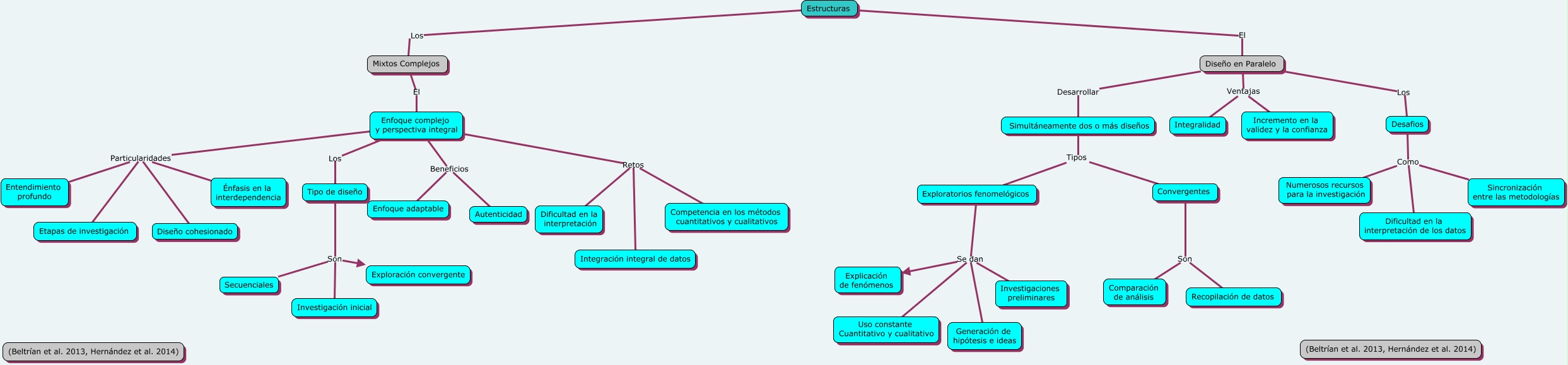 Este Cmap, tiene información relacionada con: Enfoque Cuanti y cualitativo, Estructuras El Diseño en Paralelo, Simultáneamente dos o más diseños Tipos Exploratorios fenomelógicos, Exploratorios fenomelógicos Se dan Uso constante Cuantitativo y cualitativo, Enfoque complejo y perspectiva integral Beneficios Enfoque adaptable, Enfoque complejo y perspectiva integral Retos Integración integral de datos, Tipo de diseño Son Secuenciales, Enfoque complejo y perspectiva integral Beneficios Autenticidad, Desafios Como Sincronización entre las metodologías, Simultáneamente dos o más diseños Tipos Convergentes, Enfoque complejo y perspectiva integral Particularidades Entendimiento profundo, Enfoque complejo y perspectiva integral Particularidades Diseño cohesionado, Enfoque complejo y perspectiva integral Los Tipo de diseño, Exploratorios fenomelógicos Se dan Generación de hipótesis e ideas, Exploratorios fenomelógicos Se dan Explicación de fenómenos, Convergentes Son Recopilación de datos, Diseño en Paralelo Los Desafios, Diseño en Paralelo Ventajas Incremento en la validez y la confianza, Tipo de diseño Son Investigación inicial, Exploratorios fenomelógicos Se dan Investigaciones preliminares, Tipo de diseño Son Exploración convergente