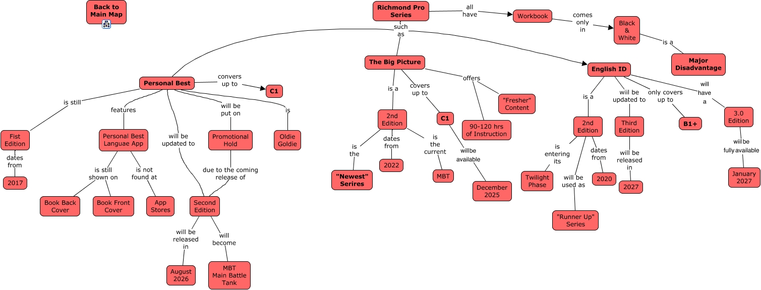 Este Cmap, tiene información relacionada con: Richmond Pro Series, Personal Best Languae App is still shown on Book Front Cover, 2nd Edition will be used as "Runner Up" Series, The Big Picture covers up to C1, Richmond Pro Series such as Personal Best, Promotional Hold due to the coming release of Second Edition, 2nd Edition is the "Newest" Serires, 2nd Edition dates from 2020, English ID is a 2nd Edition, Richmond Pro Series all have Workbook, Richmond Pro Series such as English ID, Black & White is a Major Disadvantage, Personal Best Languae App is not found at App Stores, 2nd Edition is the current MBT, Personal Best convers up to C1, Personal Best will be put on Promotional Hold, Workbook comes only in Black & White, English ID will have a 3.0 Edition, Second Edition will be released in August 2026, Personal Best is Oldie Goldie, Fist Edition dates from 2017