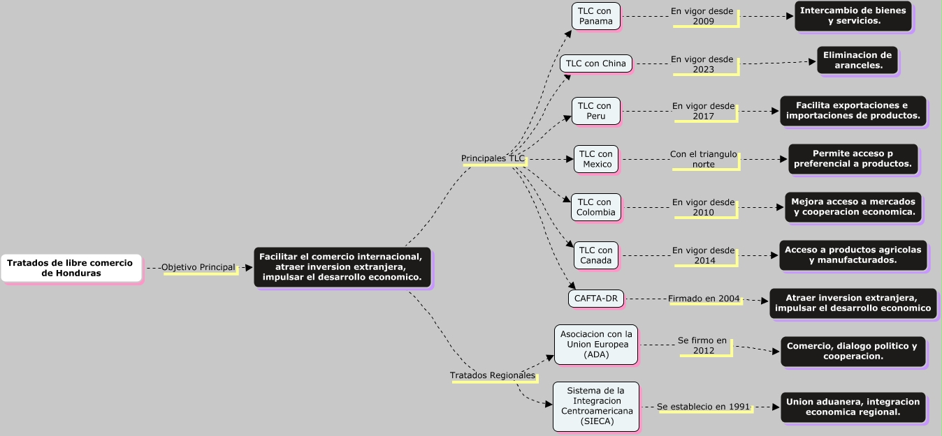 Este Cmap, tiene información relacionada con: info, CAFTA-DR Firmado en 2004 Atraer inversion extranjera, impulsar el desarrollo economico, TLC con Colombia En vigor desde 2010 Mejora acceso a mercados y cooperacion economica., Facilitar el comercio internacional, atraer inversion extranjera, impulsar el desarrollo economico. Principales TLC TLC con Peru, Facilitar el comercio internacional, atraer inversion extranjera, impulsar el desarrollo economico. Principales TLC TLC con China, Facilitar el comercio internacional, atraer inversion extranjera, impulsar el desarrollo economico. Principales TLC CAFTA-DR, Facilitar el comercio internacional, atraer inversion extranjera, impulsar el desarrollo economico. Principales TLC TLC con Mexico, TLC con Peru En vigor desde 2017 Facilita exportaciones e importaciones de productos., Asociacion con la Union Europea (ADA) Se firmo en 2012 Comercio, dialogo politico y cooperacion., TLC con Canada En vigor desde 2014 Acceso a productos agricolas y manufacturados., Facilitar el comercio internacional, atraer inversion extranjera, impulsar el desarrollo economico. Tratados Regionales Asociacion con la Union Europea (ADA), Facilitar el comercio internacional, atraer inversion extranjera, impulsar el desarrollo economico. Tratados Regionales Sistema de la Integracion Centroamericana (SIECA), TLC con Mexico Con el triangulo norte Permite acceso p preferencial a productos., Facilitar el comercio internacional, atraer inversion extranjera, impulsar el desarrollo economico. Principales TLC TLC con Panama, TLC con China En vigor desde 2023 Eliminacion de aranceles., Tratados de libre comercio de Honduras Objetivo Principal Facilitar el comercio internacional, atraer inversion extranjera, impulsar el desarrollo economico., Sistema de la Integracion Centroamericana (SIECA) Se establecio en 1991 Union aduanera, integracion economica regional., TLC con Panama En vigor desde 2009 Intercambio de bienes y servicios., Facilitar el comercio internacional, atraer inversion extranjera, impulsar el desarrollo economico. Principales TLC TLC con Colombia, Facilitar el comercio internacional, atraer inversion extranjera, impulsar el desarrollo economico. Principales TLC TLC con Canada