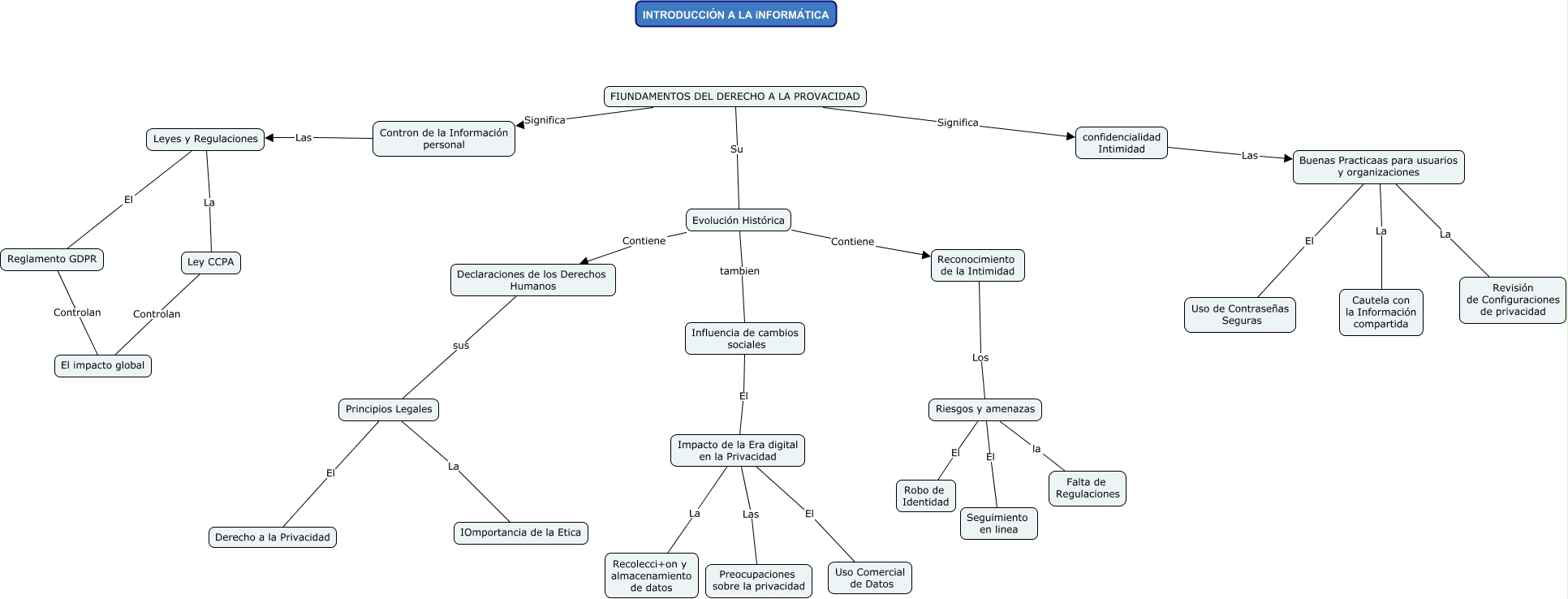 Este Cmap, tiene información relacionada con: MAPA CONCEPTUAL INFORMATICA, Leyes y Regulaciones La Ley CCPA, Impacto de la Era digital en la Privacidad La Recolecci+on y almacenamiento de datos, Buenas Practicaas para usuarios y organizaciones La Revisión de Configuraciones de privacidad, Principios Legales El Derecho a la Privacidad, FIUNDAMENTOS DEL DERECHO A LA PROVACIDAD Significa confidencialidad Intimidad, Reglamento GDPR Controlan El impacto global, Evolución Histórica tambien Influencia de cambios sociales, Riesgos y amenazas El Robo de Identidad, Buenas Practicaas para usuarios y organizaciones La Cautela con la Información compartida, Buenas Practicaas para usuarios y organizaciones El Uso de Contraseñas Seguras, Influencia de cambios sociales El Impacto de la Era digital en la Privacidad, FIUNDAMENTOS DEL DERECHO A LA PROVACIDAD Su Evolución Histórica, Declaraciones de los Derechos Humanos sus Principios Legales, Contron de la Información personal Las Leyes y Regulaciones, Riesgos y amenazas la Falta de Regulaciones, Principios Legales La IOmportancia de la Etica, Riesgos y amenazas El Seguimiento en linea, Ley CCPA Controlan El impacto global, Evolución Histórica Contiene Reconocimiento de la Intimidad, Impacto de la Era digital en la Privacidad Las Preocupaciones sobre la privacidad