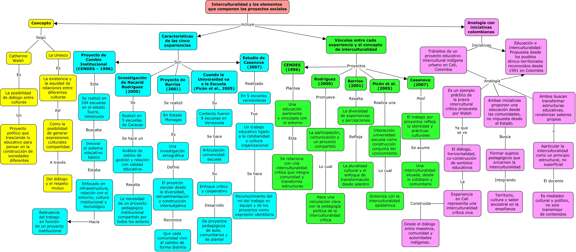 Este Cmap, tiene información relacionada con: Interculturalidad, Interculturalidad y los elementos que componen los proyectos sociales incluye Analogía con iniciativas colombianas, Concepto Segú Catherine Walsh, Formar sujetos pedagógicos que encarnen la interculturalidad Integrando Territorio, cultura y saber ancestral en la enseñanza, La diversidad de experiencias y percepciones Refleja La pluralidad cultural y el enfoque de transformación desde adentro, Interculturalidad y los elementos que componen los proyectos sociales incluye Vínculos entre cada experiencia y el concepto de interculturalidad, Interculturalidad y los elementos que componen los proyectos sociales incluye Características de las cinco experiencias, Experiencia en Cali representa una interculturalidad crítica viva Construida Desde el diálogo entre maestros, comunidad y autoridades indígenas., La posibilidad de diálogo entre culturas Un Proyecto político que trasciende lo educativo para pensar en la construcción de sociedades diferentes, CENDES (1996) Plantea Una educación pertinente y vinculada con el entorno, Analogía con iniciativas colombianas Iniciativas Educación e Interculturalidad: Propuesta desde los pueblos étnico-territoriales reconocidos desde 1991 en Colombia, Características de las cinco experiencias Son Investigación de Nacarid Rodríguez (2000), Características de las cinco experiencias Son Proyecto de Barrios (2001), Proyecto de Cambio Institucional (CENDES – 1996) Este Se realizó en 104 escuelas en el estado Sucre, Venezuela, El trabajo por proyectos refleja la identidad y prácticas culturales Se asume Una interculturalidad situada, desde lo cotidiano y comunitario, Características de las cinco experiencias Son Proyecto de Cambio Institucional (CENDES – 1996), Análisis de estilos de gestión y relación con calidad educativa. Resalta La necesidad de un proyecto pedagógico institucional compartido por todos los actores, La participación, comunicación y un proyecto compartido Lo cual Hace una vinculación clara con la pedagogía política de la interculturalidad crítica, Una investigación etnográfica Define El proyecto escolar desde la diversidad, retroalimentación y construcción intersubjetiva, El diálogo, horizontalidad, co-construcción de sentidos educativos La Experiencia en Cali representa una interculturalidad crítica viva, Concepto Segú La Unesco