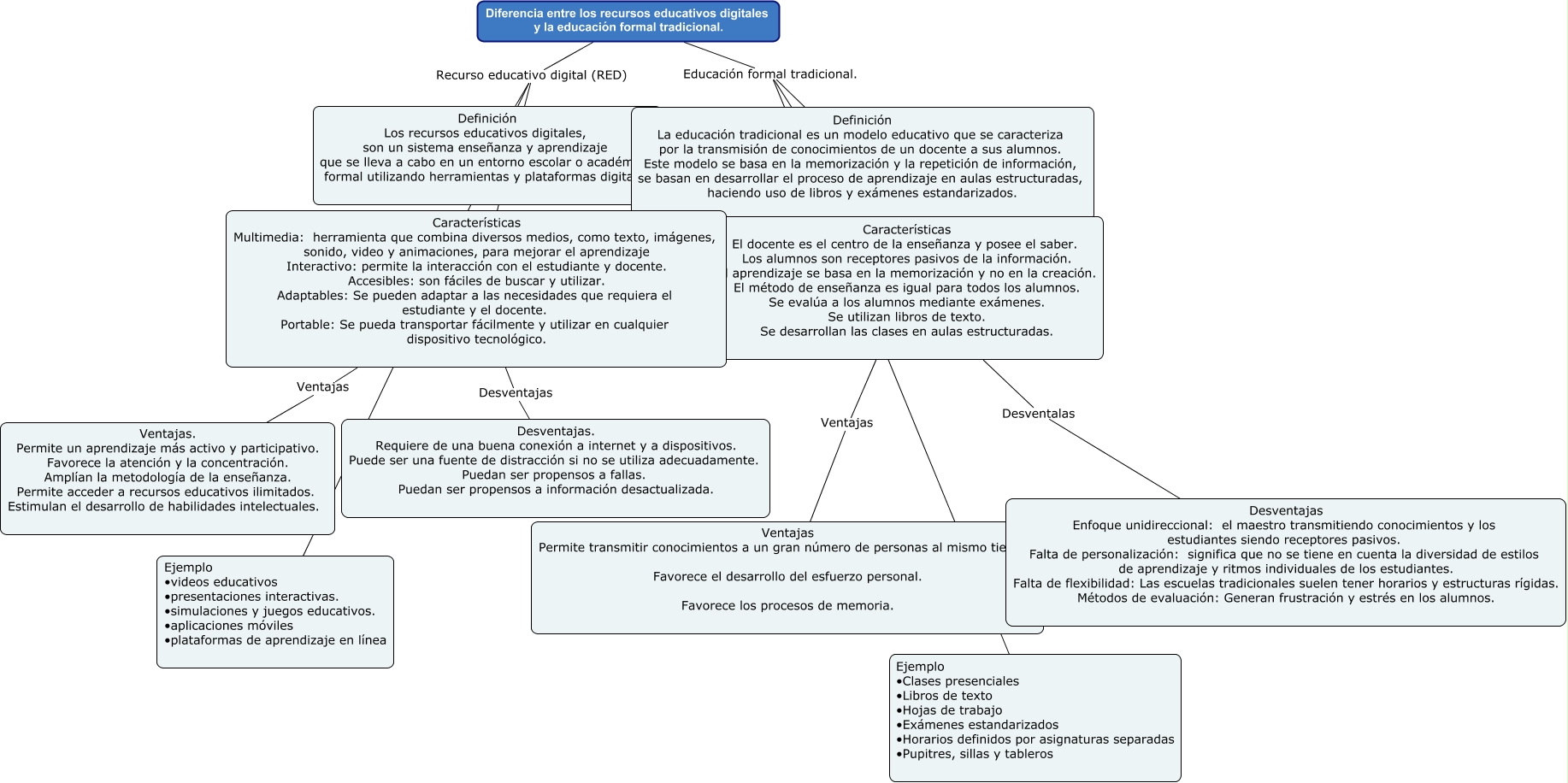 Este Cmap, tiene información relacionada con: DIFERENCIA ENTRE LOS RECURSOS EDUCATIVOS Y EDUCACION TRADICIONAL, Diferencia entre los recursos educativos digitales y la educación formal tradicional. Educación formal tradicional. Definición La educación tradicional es un modelo educativo que se caracteriza por la transmisión de conocimientos de un docente a sus alumnos. Este modelo se basa en la memorización y la repetición de información, se basan en desarrollar el proceso de aprendizaje en aulas estructuradas, haciendo uso de libros y exámenes estandarizados., Características Multimedia: herramienta que combina diversos medios, como texto, imágenes, sonido, video y animaciones, para mejorar el aprendizaje Interactivo: permite la interacción con el estudiante y docente. Accesibles: son fáciles de buscar y utilizar. Adaptables: Se pueden adaptar a las necesidades que requiera el estudiante y el docente. Portable: Se pueda transportar fácilmente y utilizar en cualquier dispositivo tecnológico. Ventajas Ventajas. Permite un aprendizaje más activo y participativo. Favorece la atención y la concentración. Amplían la metodología de la enseñanza. Permite acceder a recursos educativos ilimitados. Estimulan el desarrollo de habilidades intelectuales., Diferencia entre los recursos educativos digitales y la educación formal tradicional. Educación formal tradicional. Características El docente es el centro de la enseñanza y posee el saber. Los alumnos son receptores pasivos de la información. El aprendizaje se basa en la memorización y no en la creación. El método de enseñanza es igual para todos los alumnos. Se evalúa a los alumnos mediante exámenes. Se utilizan libros de texto. Se desarrollan las clases en aulas estructuradas., Diferencia entre los recursos educativos digitales y la educación formal tradicional. Recurso educativo digital (RED) Características Multimedia: herramienta que combina diversos medios, como texto, imágenes, sonido, video y animaciones, para mejorar el aprendizaje Interactivo: permite la interacción con el estudiante y docente. Accesibles: son fáciles de buscar y utilizar. Adaptables: Se pueden adaptar a las necesidades que requiera el estudiante y el docente. Portable: Se pueda transportar fácilmente y utilizar en cualquier dispositivo tecnológico., Diferencia entre los recursos educativos digitales y la educación formal tradicional. Educación formal tradicional. Ejemplo • Clases presenciales • Libros de texto • Hojas de trabajo • Exámenes estandarizados • Horarios definidos por asignaturas separadas • Pupitres, sillas y tableros, Características El docente es el centro de la enseñanza y posee el saber. Los alumnos son receptores pasivos de la información. El aprendizaje se basa en la memorización y no en la creación. El método de enseñanza es igual para todos los alumnos. Se evalúa a los alumnos mediante exámenes. Se utilizan libros de texto. Se desarrollan las clases en aulas estructuradas. Desventalas Desventajas Enfoque unidireccional: el maestro transmitiendo conocimientos y los estudiantes siendo receptores pasivos. Falta de personalización: significa que no se tiene en cuenta la diversidad de estilos de aprendizaje y ritmos individuales de los estudiantes. Falta de flexibilidad: Las escuelas tradicionales suelen tener horarios y estructuras rígidas. Métodos de evaluación: Generan frustración y estrés en los alumnos., Diferencia entre los recursos educativos digitales y la educación formal tradicional. Recurso educativo digital (RED) Ejemplo • videos educativos • presentaciones interactivas. • simulaciones y juegos educativos. • aplicaciones móviles • plataformas de aprendizaje en línea, Características Multimedia: herramienta que combina diversos medios, como texto, imágenes, sonido, video y animaciones, para mejorar el aprendizaje Interactivo: permite la interacción con el estudiante y docente. Accesibles: son fáciles de buscar y utilizar. Adaptables: Se pueden adaptar a las necesidades que requiera el estudiante y el docente. Portable: Se pueda transportar fácilmente y utilizar en cualquier dispositivo tecnológico. Desventajas Desventajas. Requiere de una buena conexión a internet y a dispositivos. Puede ser una fuente de distracción si no se utiliza adecuadamente. Puedan ser propensos a fallas. Puedan ser propensos a información desactualizada., Características El docente es el centro de la enseñanza y posee el saber. Los alumnos son receptores pasivos de la información. El aprendizaje se basa en la memorización y no en la creación. El método de enseñanza es igual para todos los alumnos. Se evalúa a los alumnos mediante exámenes. Se utilizan libros de texto. Se desarrollan las clases en aulas estructuradas. Ventajas Ventajas Permite transmitir conocimientos a un gran número de personas al mismo tiempo. Favorece el desarrollo del esfuerzo personal. Favorece los procesos de memoria., Diferencia entre los recursos educativos digitales y la educación formal tradicional. Recurso educativo digital (RED) Definición Los recursos educativos digitales, son un sistema enseñanza y aprendizaje que se lleva a cabo en un entorno escolar o académico formal utilizando herramientas y plataformas digitales