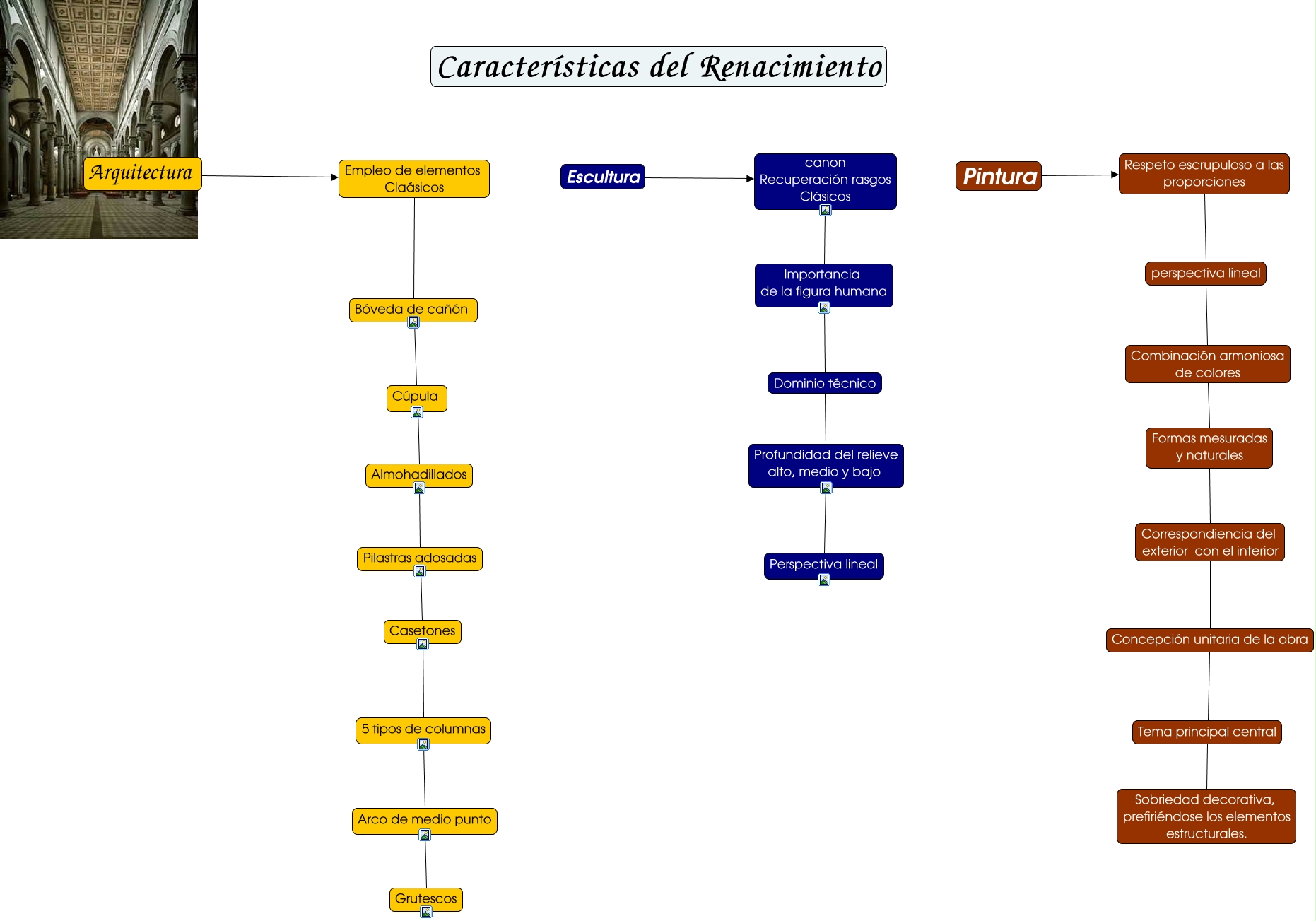 Este Cmap, tiene información relacionada con: Características Renacimiento, Pintura Respeto escrupuloso a las proporciones, Profundidad del relieve alto, medio y bajo Perspectiva lineal, Tema principal central Sobriedad decorativa, prefiriéndose los elementos estructurales., Arquitectura Empleo de elementos Claásicos, Bóveda de cañón Cúpula, Combinación armoniosa de colores Formas mesuradas y naturales, Cúpula Almohadillados, Correspondiencia del exterior con el interior Concepción unitaria de la obra, Importancia de la figura humana Dominio técnico, Respeto escrupuloso a las proporciones perspectiva lineal, Almohadillados Pilastras adosadas, perspectiva lineal Combinación armoniosa de colores, Dominio técnico Profundidad del relieve alto, medio y bajo, Concepción unitaria de la obra Tema principal central, Escultura canon Recuperación rasgos Clásicos, 5 tipos de columnas Arco de medio punto, Formas mesuradas y naturales Correspondiencia del exterior con el interior, Empleo de elementos Claásicos Bóveda de cañón, Arco de medio punto Grutescos, Casetones 5 tipos de columnas