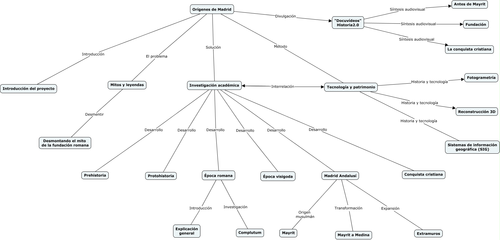 Este Cmap, tiene información relacionada con: Historia2.0. Mapa conceptual. R3 A1, "Docuvídeos" Historia2.0 Síntesis audiovisual Fundación, Madrid Andalusí Expansión Extramuros, Época romana Introducción Explicación general, Orígenes de Madrid Divulgación "Docuvídeos" Historia2.0, "Docuvídeos" Historia2.0 Síntesis audiovisual La conquista cristiana, Madrid Andalusí Origen musulmán Mayrit, Investigación académica Desarrollo Conquista cristiana, Época romana Investigación Complutum, Investigación académica Desarrollo Época visigoda, Tecnología y patrimonio Historia y tecnología Reconstrucción 3D, Tecnología y patrimonio Historia y tecnología Fotogrametría, Mitos y leyendas Desmentir Desmontando el mito de la fundación romana, Orígenes de Madrid Introducción Introducción del proyecto, Orígenes de Madrid Método Tecnología y patrimonio, Investigación académica Desarrollo Prehistoria, Investigación académica Desarrollo Época romana, "Docuvídeos" Historia2.0 Síntesis audiovisual Antes de Mayrit, Investigación académica Desarrollo Madrid Andalusí, Madrid Andalusí Transformación Mayrit a Medina, Investigación académica Desarrollo Protohistoria