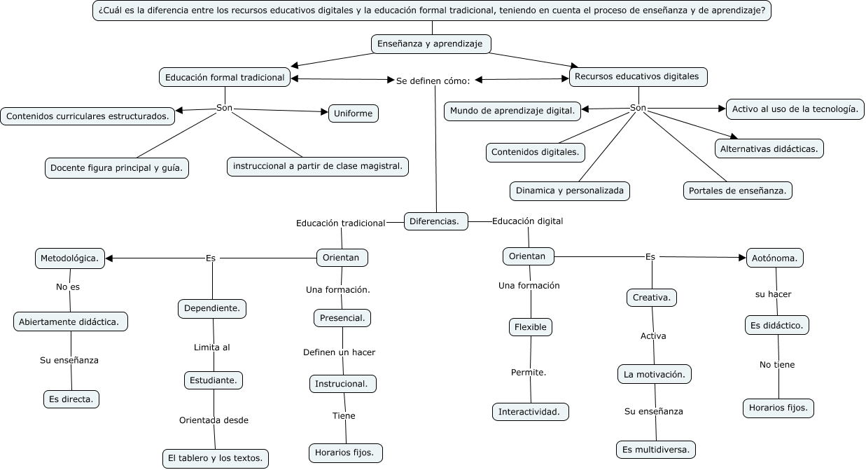 Este Cmap, tiene información relacionada con: Mapa mental, Flexible Permite. Interactividad., Orientan Es Aotónoma., La motivación. Su enseñanza Es multidiversa., Recursos educativos digitales Son Contenidos digitales., Estudiante. Orientada desde El tablero y los textos., Orientan Es Metodológica., Orientan Una formación Flexible, Recursos educativos digitales Son Activo al uso de la tecnología., Educación formal tradicional Son Uniforme, Metodológica. No es Abiertamente didáctica., Educación formal tradicional Se definen cómo: Recursos educativos digitales, Abiertamente didáctica. Su enseñanza Es directa., Orientan Es Creativa., Instrucional. Tiene Horarios fijos., Diferencias. Educación digital Orientan, Diferencias. Educación tradicional Orientan, Aotónoma. su hacer Es didáctico., Dependiente. Limita al Estudiante., Es didáctico. No tiene Horarios fijos., Recursos educativos digitales Son Portales de enseñanza.