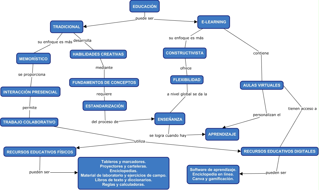 Este Cmap, tiene información relacionada con: Educacion, MEMORÍSTICO se proporciona INTERACCIÓN PRESENCIAL, ESTANDARIZACIÓN del proceso de ENSEÑANZA, FLEXIBILIDAD a nivel global se da la ENSEÑANZA, EDUCACIÓN puede ser TRADICIONAL, EDUCACIÓN puede ser E-LEARNING, AULAS VIRTUALES personalizan el APRENDIZAJE, INTERACCIÓN PRESENCIAL permite TRABAJO COLABORATIVO, RECURSOS EDUCATIVOS DIGITALES pueden ser Software de aprendizaje. Enciclopedia en línea. Canva y gamificación., E-LEARNING contiene AULAS VIRTUALES, TRABAJO COLABORATIVO utiliza RECURSOS EDUCATIVOS FÍSICOS, AULAS VIRTUALES tienen acceso a RECURSOS EDUCATIVOS DIGITALES, TRADICIONAL desarrolla HABILIDADES CREATIVAS, ENSEÑANZA se logra cuando hay APRENDIZAJE, CONSTRUCTIVISTA ofrece FLEXIBILIDAD, TRADICIONAL su enfoque es más MEMORÍSTICO, HABILIDADES CREATIVAS mediante FUNDAMENTOS DE CONCEPTOS, E-LEARNING su enfoque es más CONSTRUCTIVISTA, RECURSOS EDUCATIVOS FÍSICOS pueden ser Tableros y marcadores. Proyectores y carteleras. Enciclopedias. Material de laboratorio y ejercicios de campo. Libros de texto y diccionarios. Reglas y calculadoras., FUNDAMENTOS DE CONCEPTOS requiere ESTANDARIZACIÓN, TRABAJO COLABORATIVO utiliza RECURSOS EDUCATIVOS DIGITALES
