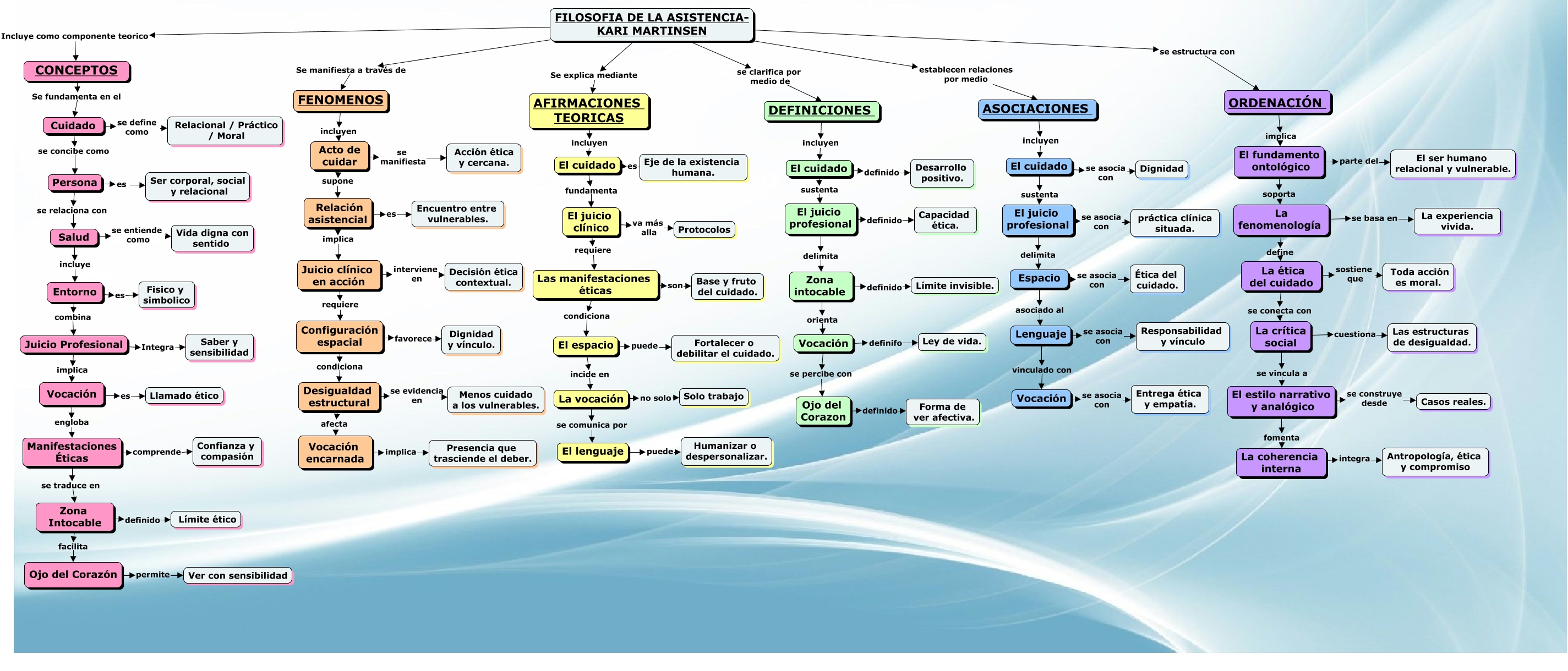 Este Cmap, tiene información relacionada con: KAROL ARREDONDO- FILOSOFIA DE LA ASISTENCIA- PRODUCTO MOMENTO II, FILOSOFIA DE LA ASISTENCIA- KARI MARTINSEN se estructura con ORDENACIÓN, Espacio asociado al Lenguaje, Entorno es Fisico y simbolico, DEFINICIONES incluyen El cuidado, El cuidado definido Desarrollo positivo., La ética del cuidado se conecta con La crítica social, Configuración espacial favorece Dignidad y vínculo., La fenomenología se basa en La experiencia vivida., El lenguaje puede Humanizar o despersonalizar., Desigualdad estructural se evidencia en Menos cuidado a los vulnerables., Zona Intocable definido Límite ético, Juicio Profesional implica Vocación, Juicio clínico en acción requiere Configuración espacial, El espacio incide en La vocación, La ética del cuidado sostiene que Toda acción es moral., La vocación no solo Solo trabajo, Cuidado se define como Relacional / Práctico / Moral, Zona Intocable facilita Ojo del Corazón, Las manifestaciones éticas condiciona El espacio, Juicio clínico en acción interviene en Decisión ética contextual.