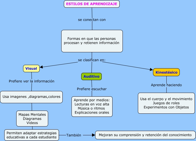 Este Cmap, tiene información relacionada con: PA2 REYNA PS. INSTRUCIONAL, Mapas Mentales Diagramas Videos ???? Permiten adaptar estrategias educativas a cada estudiante, Permiten adaptar estrategias educativas a cada estudiante También Mejoran su comprensión y retención del conocimiento, Formas en que las personas procesan y retienen información se clasifican en: Auditivo, Formas en que las personas procesan y retienen información se clasifican en: Kinestésico, Auditivo Prefiere escuchar Aprende por medios: Lecturas en voz alta Música o ritmos Explicaciones orales, Usa imagenes ,diagramas,colores ???? Mapas Mentales Diagramas Videos, ESTILOS DE APRENDIZAJE se conectan con Formas en que las personas procesan y retienen información, Permiten adaptar estrategias educativas a cada estudiante También Mejoran su comprensión y retención del conocimiento, Formas en que las personas procesan y retienen información se clasifican en: Visual, Kinestésico Aprende haciendo Usa el cuerpo y el movimiento Juegos de roles Experimentos con Objetos, Visual Prefiere ver la información Usa imagenes ,diagramas,colores, Permiten adaptar estrategias educativas a cada estudiante También Mejoran su comprensión y retención del conocimiento
